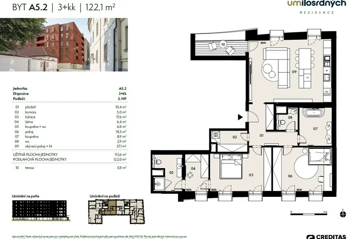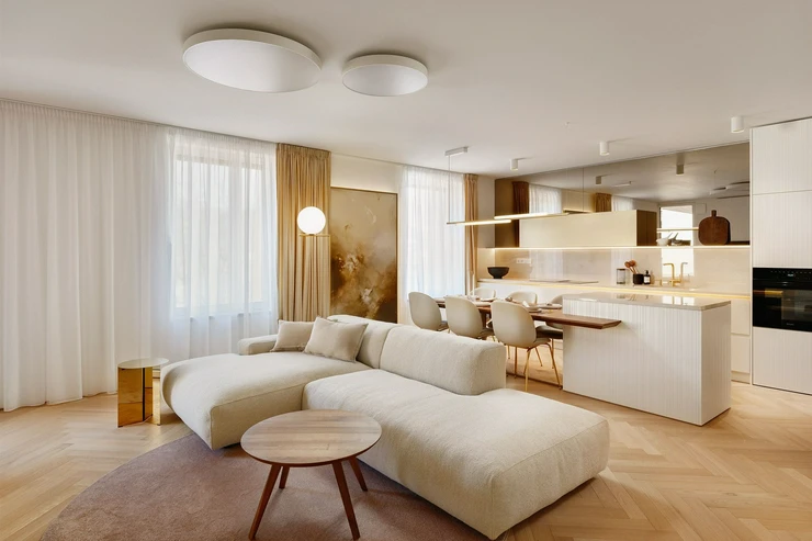 We offer for rent a premium 3+kk apartment with an area of 122 m2 and a terrace of 5.8 m2 in the entirely new development project U Milosrdných, which is a masterpiece by the renowned architect Zdeněk Fránek. The apartment is located on the 4th floor.