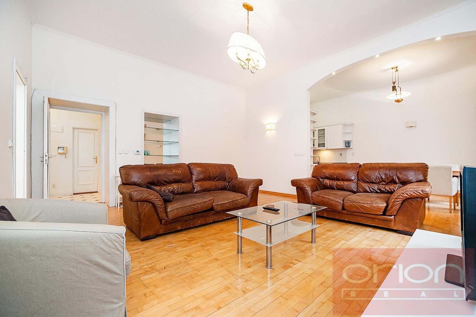 The apartment boasts high ceilings, parquet floors and tiles, and gas heating. Furnishings include large built-in wardrobes in the hallway and bedroom, a dining table with chairs, beds in the bedrooms, and a TV stand with a TV. sofa.