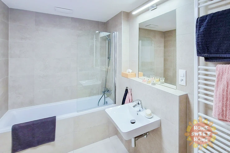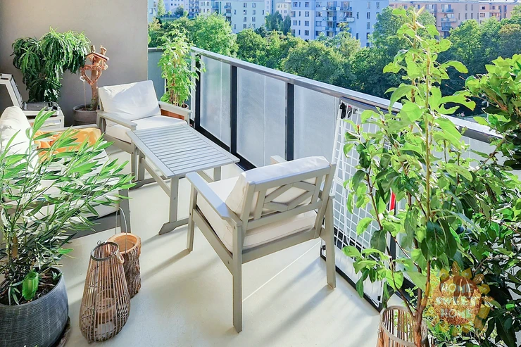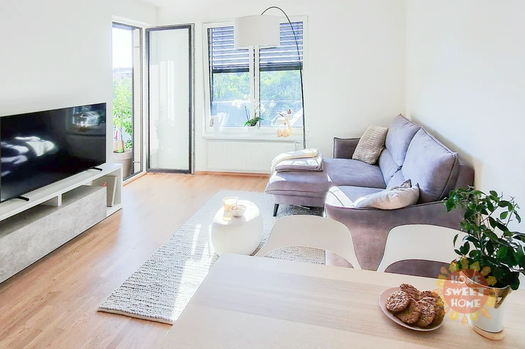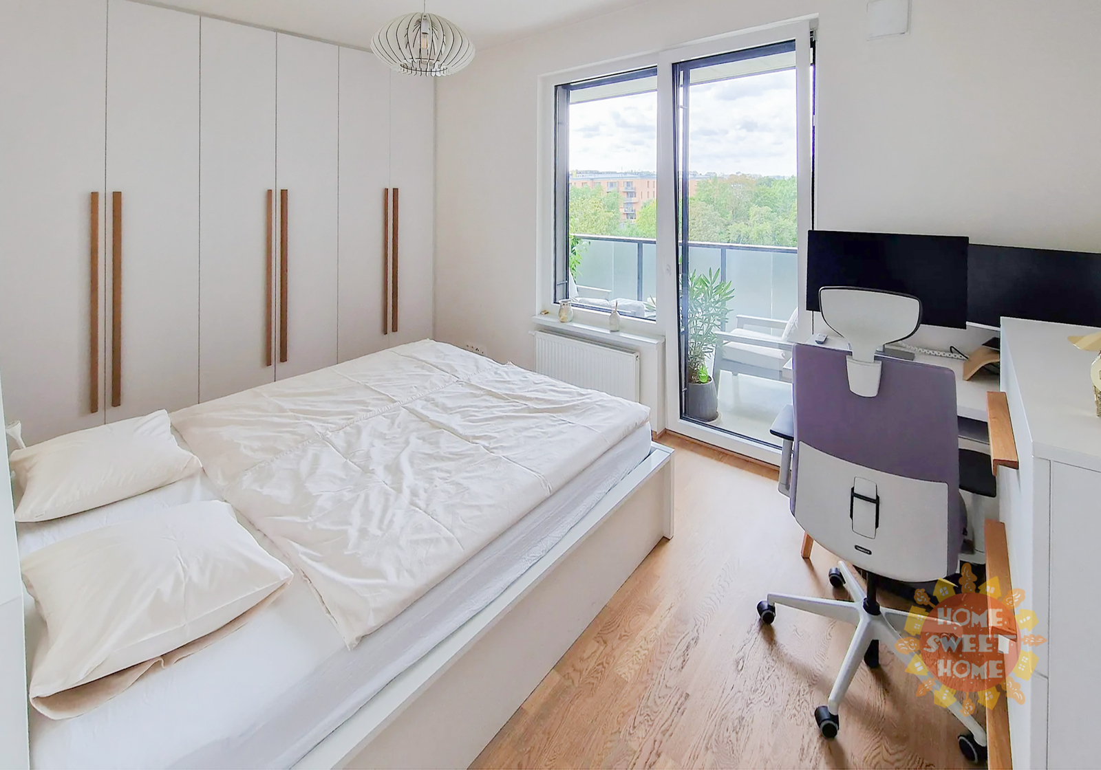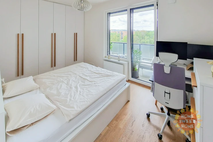 The interior is fully and tastefully furnished with premium furniture and appliances. The kitchen is equipped with AEG appliances, including an induction hob, dishwasher, and coffee maker. The living area features a comfortable sofa, a Samsung Smart TV, and a full workspace with an ergonomic chair and monitor. The bedroom is fitted with a bed featuring a quality mattress and built-in wardrobes. Maximum comfort is ensured by remote-controlled exterior blinds, a washer-dryer, a robotic vacuum cleaner, and high-speed internet (1000 Mbps). The southwest orientation and large balcony with outdoor seating and greenery offer a beautiful view of the river meander.