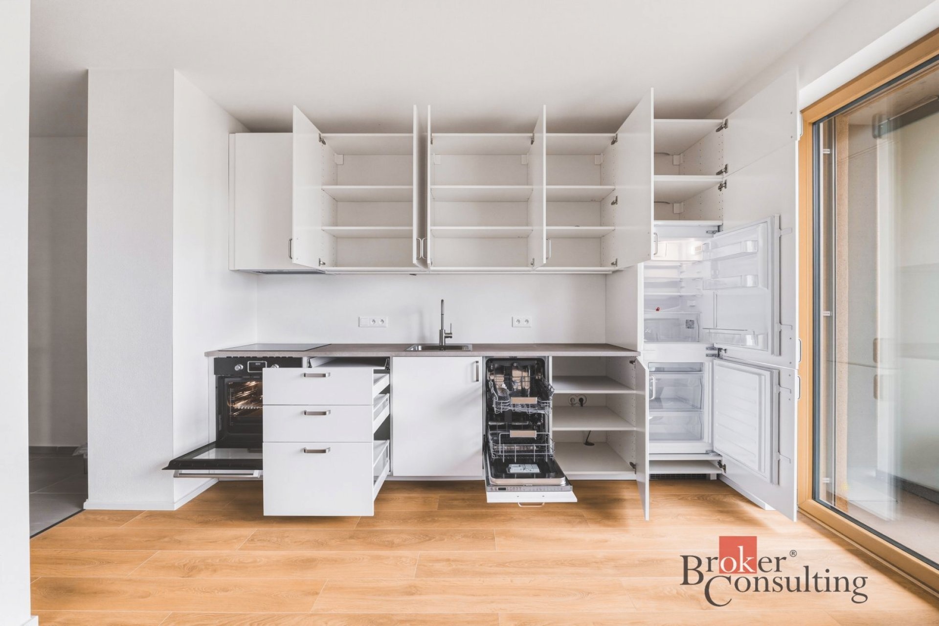 Byt se nachází ve 4. nadzemním podlaží a je vybaven kuchyňskou linkou včetně spotřebičů (trouba, varná deska, myčka, lednice a mrazák).