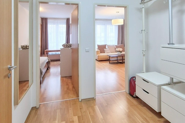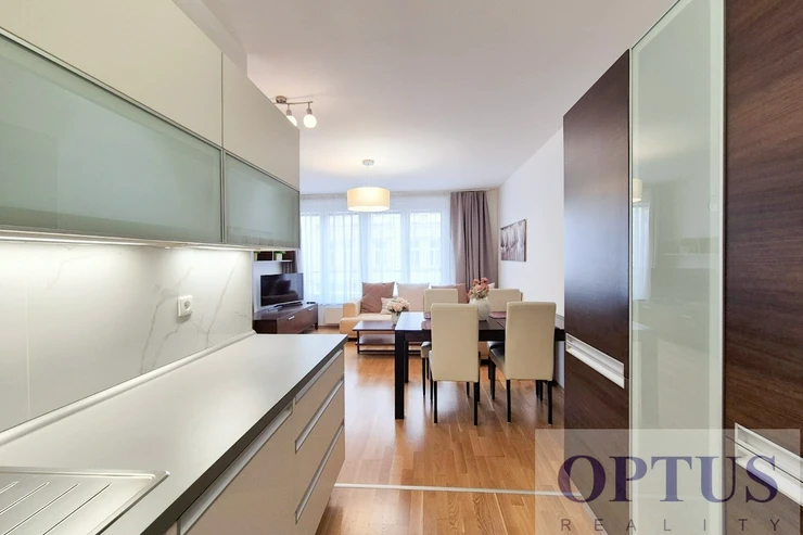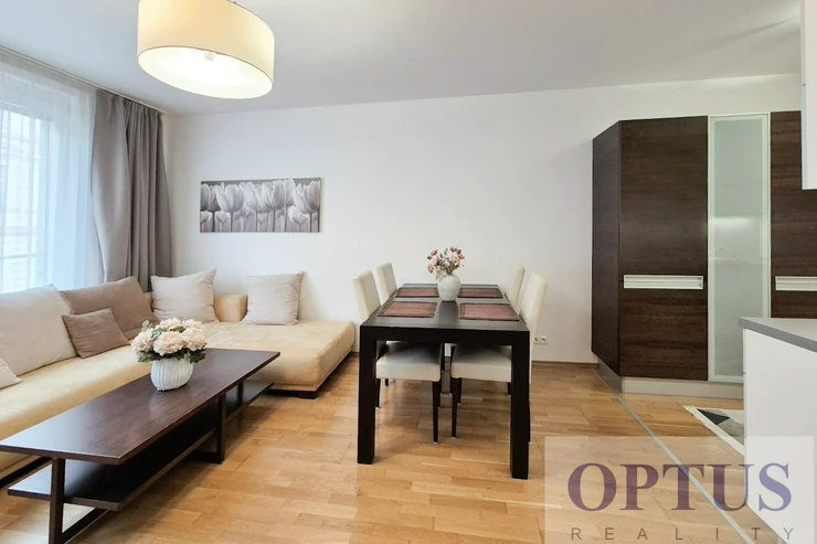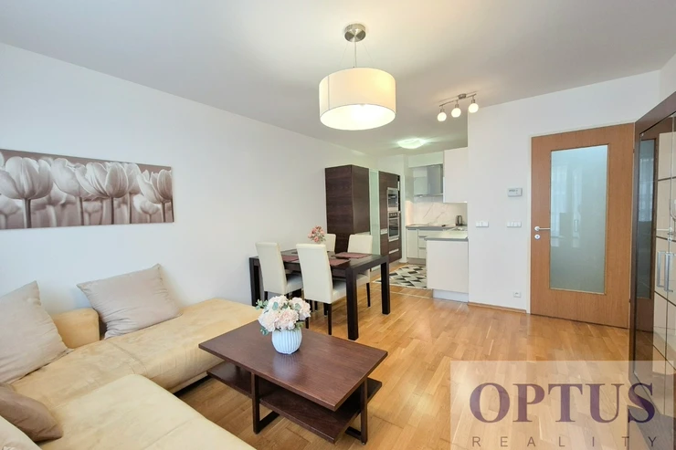 Modern fully furnished apartment size 2 + kitchen corner (in area of 52.4 m2) with an east orientation; situated on the 2nd above floor with lift in a modern residential building. The apartment consists of an open space living room with a dining area and with a fully fitted kitchen corner, one bedroom, one full bathroom (with a bath tube and a toilet), and an entrance hallway.
