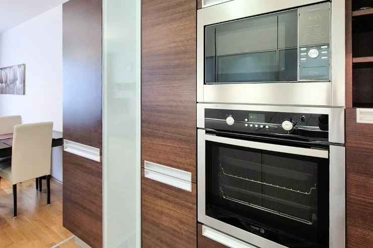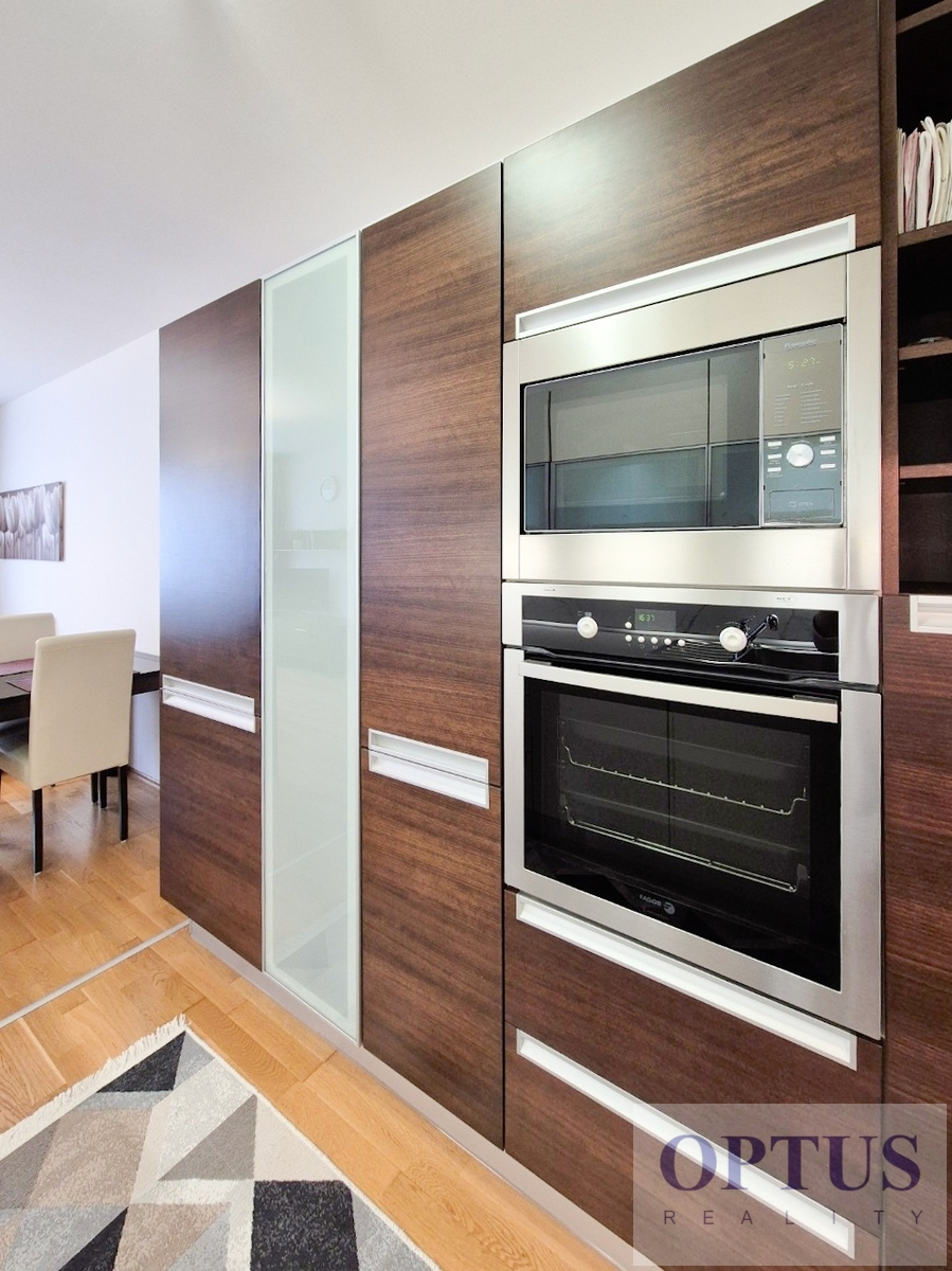 Other equipment of the apartment: a fully equipped modern design kitchen unit including built-in appliances (electric cooking hob, electric oven, dishwasher, microwave, and refrigerator with freezer), furniture and equipment according to photos, washing machine, cabling for high-speed internet connection (up to 1 Gb/s), wooden floors, individual gas boiler in the apartment.