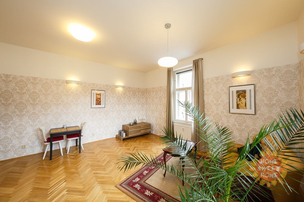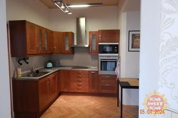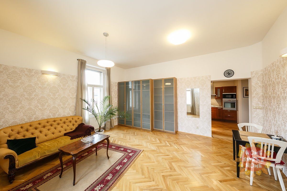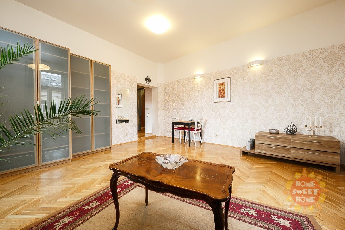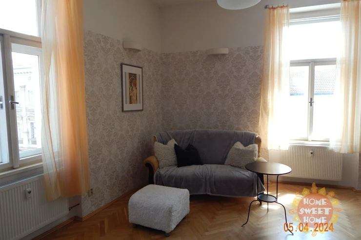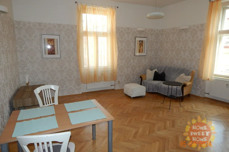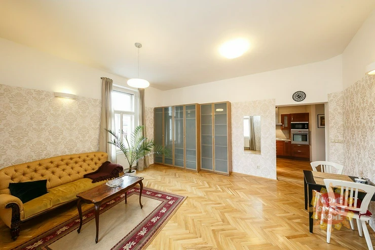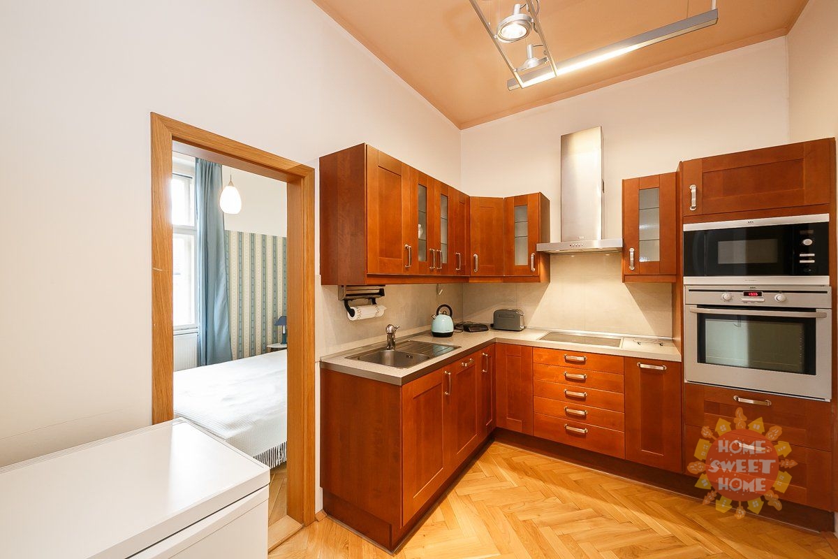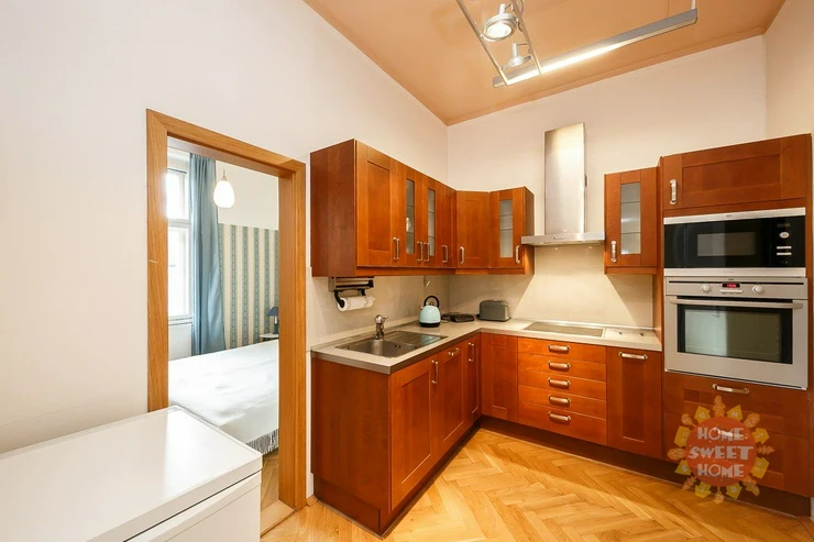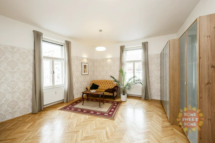 entrance hall, modern kitchenette (equipped with a fridge with freezer, induction hob, electric oven, microwave and dishwasher), spacious corner living room with a view of Malátova and V Lesíčku streets, separate bedroom, storage room with washing machine, bathroom with bathtub, shower and toilet. Other amenities of the apartment: ceiling storage space. Casement windows are significantly framed by columns and decorative elements, parquet and tile floors, central heating, high-speed internet access, cellar available. The apartment has been renovated and is soundproofed, guaranteeing the comfort of quiet living.