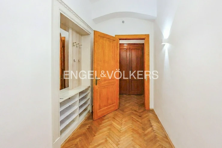 The apartment consists of an entrance hall, a living room with a fully equipped kitchenette (fridge, dishwasher, oven, glass-ceramic hob, hood), two bedrooms, a walk-in closet, and a bathroom with a toilet and a shower. Parquet floors are throughout the apartment, with tiles in the bathroom; the interior is complemented by solid wood doors and refurbished wooden casement windows. Heating and water heating are provided by a private gas boiler, and there is a connection for a washing machine in the bathroom.