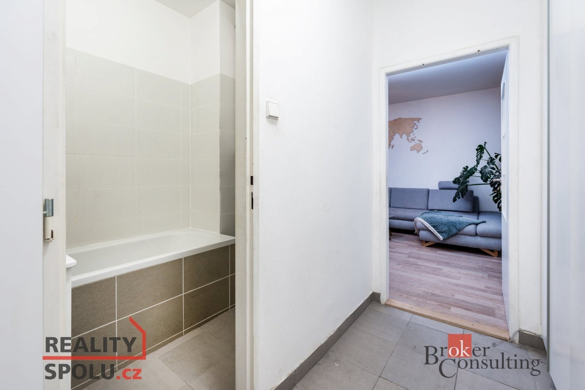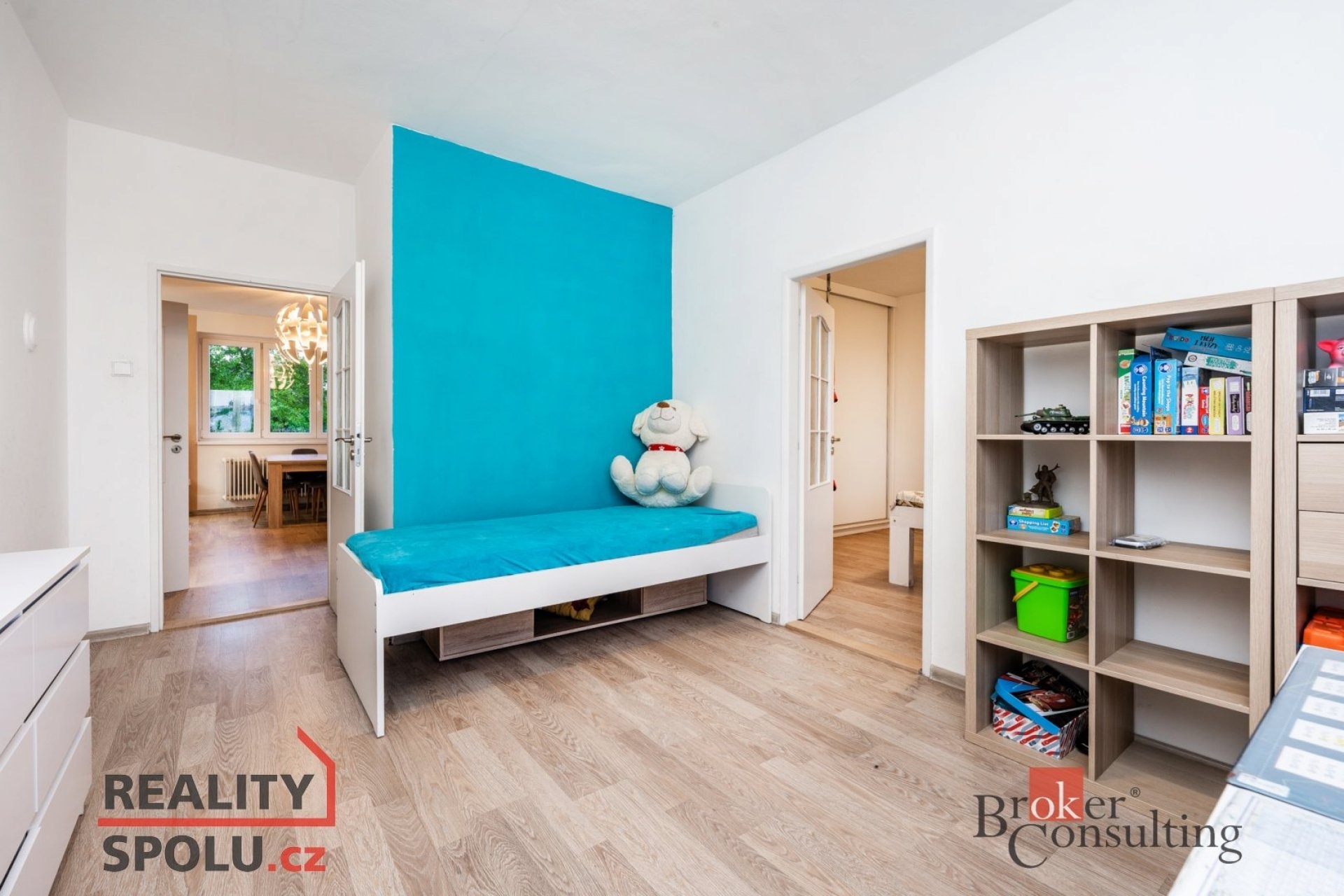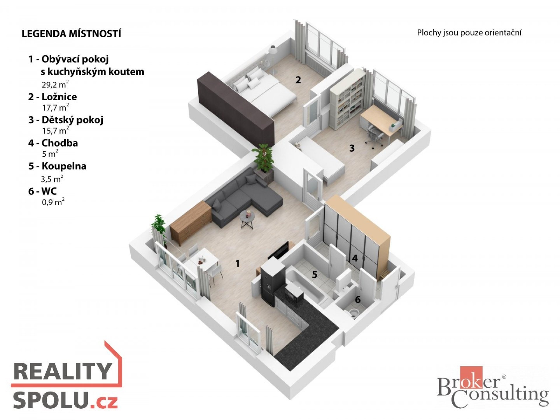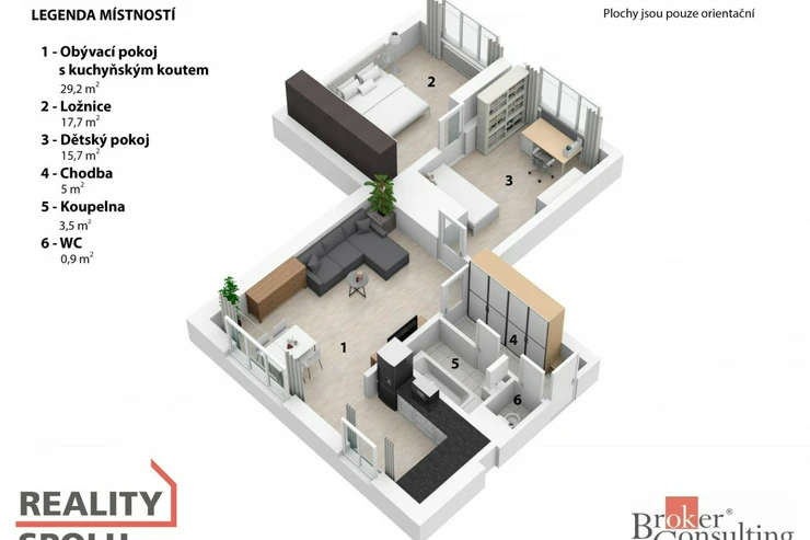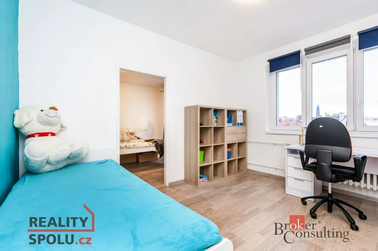 Dispozice bytu: vstupní chodba s vestavěnou skříní, WC, koupelna, obývací pokoj propojený s kuchyňskou linkou, dětský pokoj, ze kterého je vstup do ložnice.