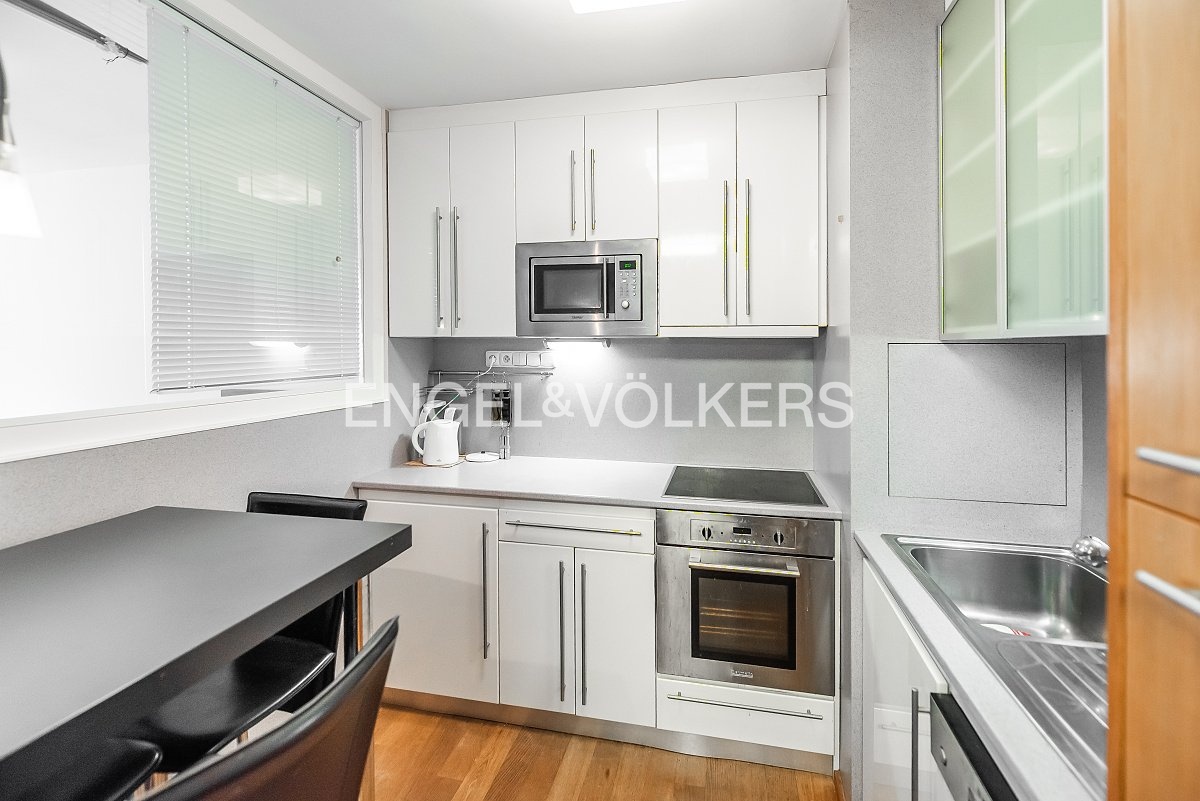 The layout of the apartment includes a spacious entrance hall with built-in storage, a living room with a separate kitchenette equipped with appliances (fridge-freezer, dishwasher, electric oven, and hob), and an enclosable loggia with an area of 8 sqm. The apartment features one separate bedroom and a bathroom with a bathtub, washbasin, and toilet. The apartment is rented fully furnished and includes a cellar cubicle. The flooring consists of wooden floors, and the windows are plastic. Heating is provided centrally.