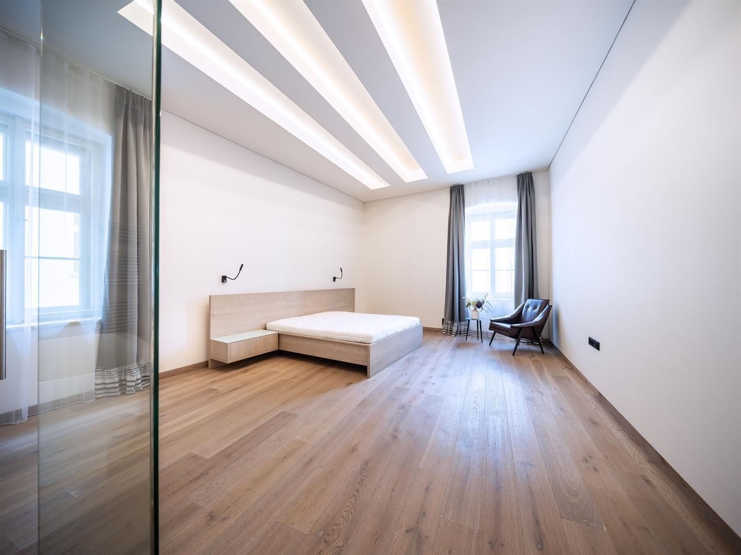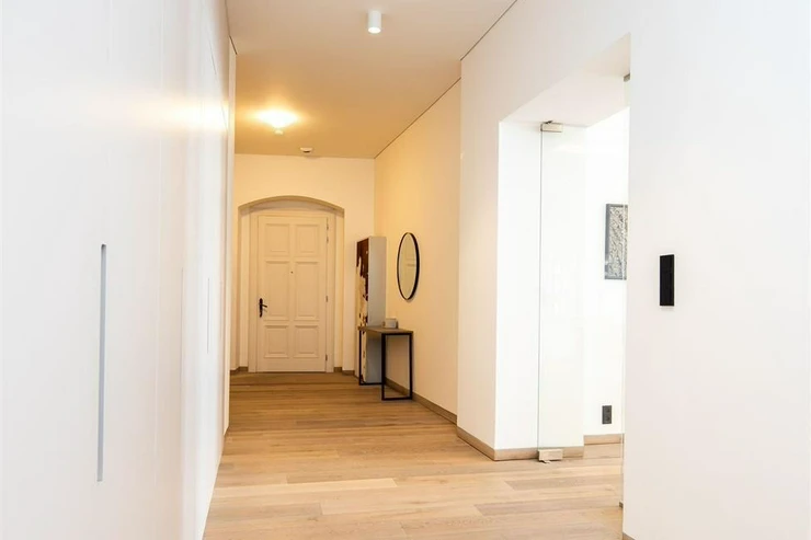 From the direct owner, we are offering premium rental housing in Prague 1 on Truhlářská Street. The 3+kk apartment with a size of 181 m2 is located on the 3rd above-ground floor in a renovated building with an elevator. The interior’s appearance was meticulously designed by the renowned architectural studio de.fakto, focusing on functionality and design. The highlight of the apartment is a spacious and bright living room, thanks to the abundance of windows, connected to a fully equipped kitchen and dining area. Additionally, this generously designed apartment features a master bedroom with a fully equipped en-suite bathroom furnished with Preciosa brand products, a second bedroom, a dressing room, and a separate bathroom with a bathtub, shower stall, toilet, and bidet shower. The spacious entrance hall hides built-in wardrobes that provide elegantly designed storage space. High-speed internet is installed in the apartment (included in the rent). The apartment's heating and cooling are ceiling-integrated.