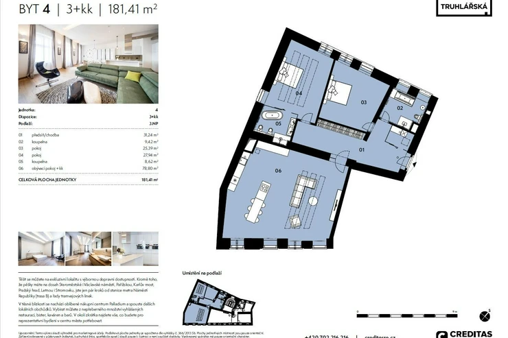 Discover premium living on Truhlářská Street in the heart of Prague, offering luxurious, furnished modern apartments in a newly renovated historic Neoclassical residence. An advantageous location with excellent transportation access. In addition to being within walking distance to Old Town Square, Wenceslas Square, Paris Street, Charles Bridge, Prague Castle, Letná and Stromovka, you are just a few steps away from the Náměstí Republiky metro station (line B) and numerous tram lines. Nearby are the popular shopping centers Palladium and Kotva.