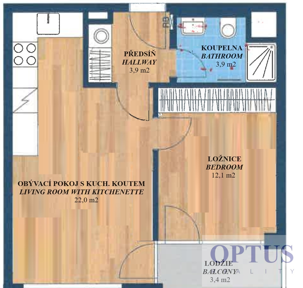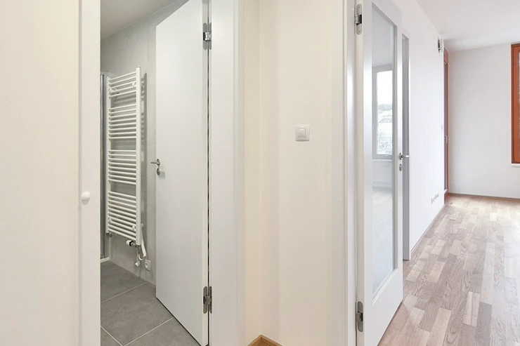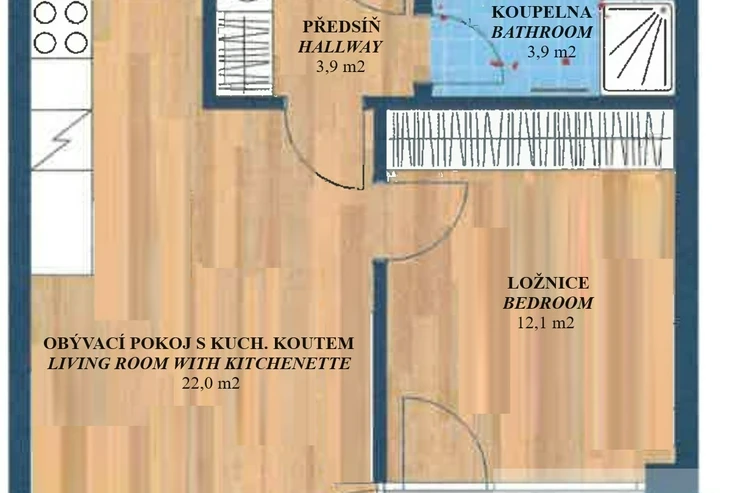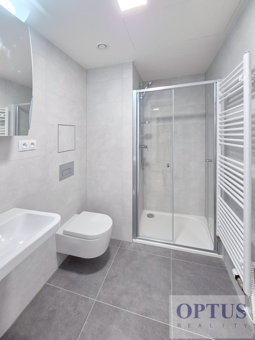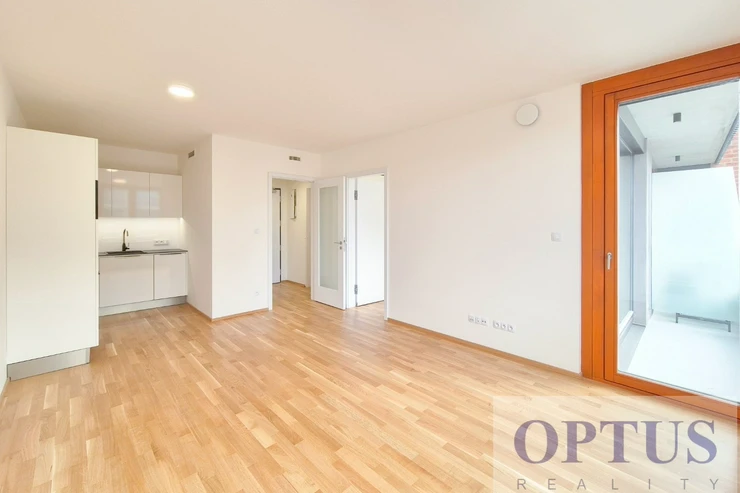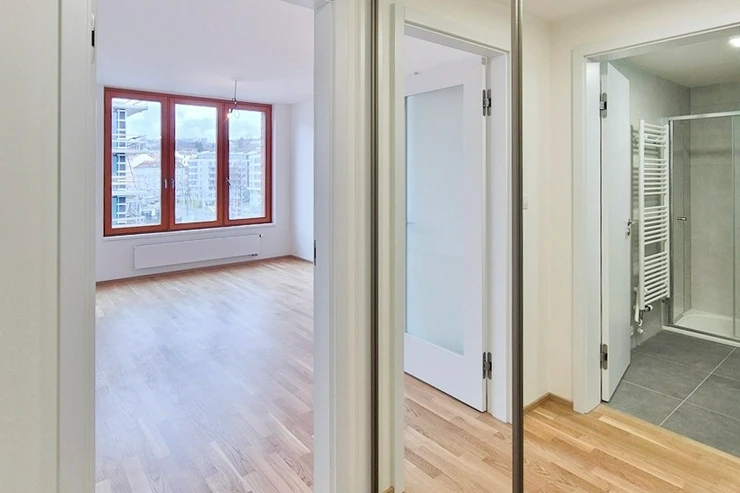 Brand new high-quality unfurnished apartment size 2 + kitchen corner (in area of 44.2 m2) + balcony of 3.4 m2 - west orientation; situated on the 5th floor with lift in a new residential complex Smíchov City. The apartment consists of an open space living room of 22 m2 with a fully fitted kitchen and access to the balcony, one bedroom of 12.1 m2, one full bathroom (with a shower corner and a toilet), and an entrance hallway.