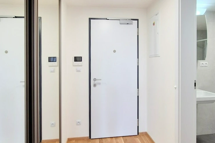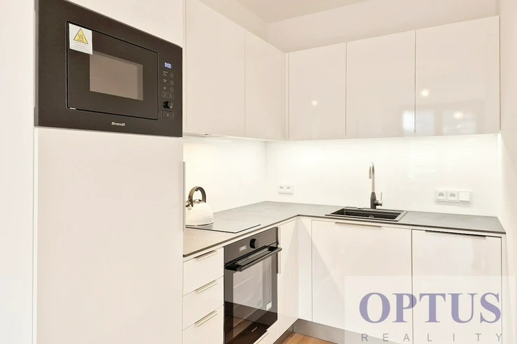 Other equipment of the apartment: a fully equipped design kitchen unit including built-in appliances (electric cooking hob, electric oven, dishwasher, microwave, and refrigerator with freezer), built-in wardrobes in the bedroom and in the entrance hallway, light fixtures, cabling for high-speed internet connection (up to 2 Gb/s), wooden floors, central heating, and recuperation ventilation system.