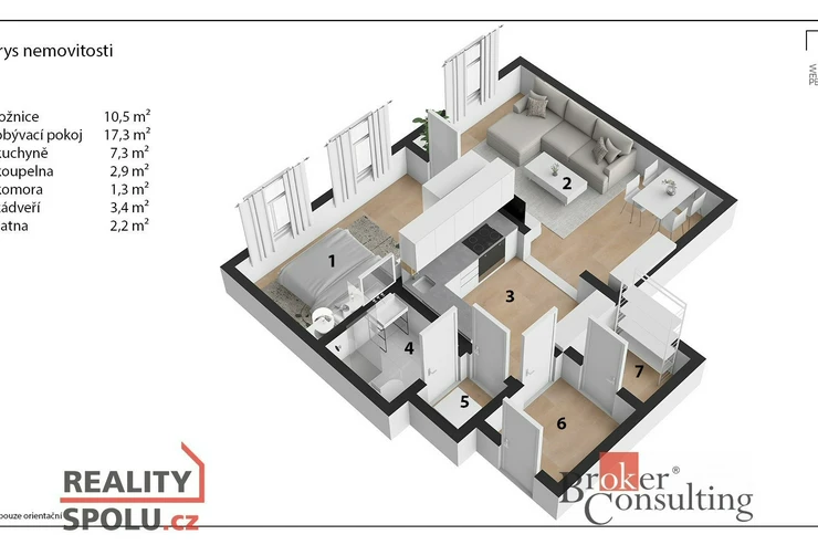 Byt se skládá ze vstupní chodby, kuchyně, dvou pokojů, koupelny a WC. Vytápění bytu je ústřední a TUV centrální ze společné kotelny v domě. V r. 2021 prošel byt celkovou modernizací a nachází se ve velmi dobrém stavu.