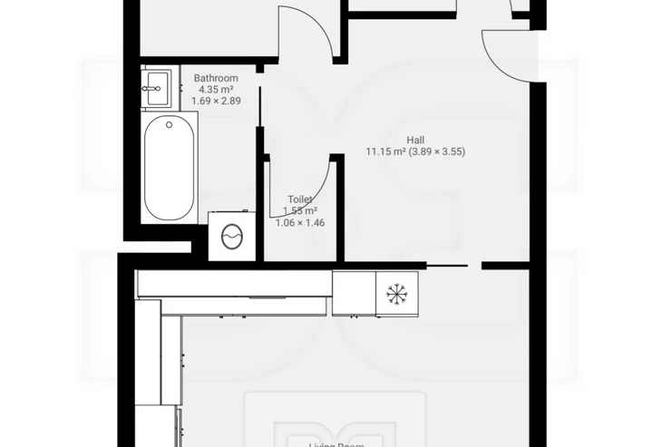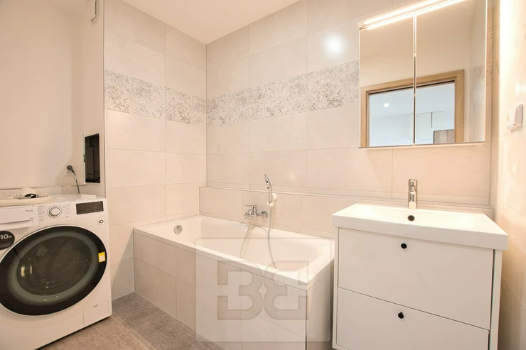 The apartment features a spacious living room with a modern kitchenette and access to a balcony. The kitchen includes a refrigerator, dishwasher, convection oven, microwave, induction cooktop, and plenty of counter and storage space. The apartment offers 2 separate bedrooms. The bathroom is equipped with a bathtub and a washing machine. The toilet is separate. There is a storage area on the floor opposite the apartment. Additionally, a stroller storage room on the ground floor of the building is available for use.
