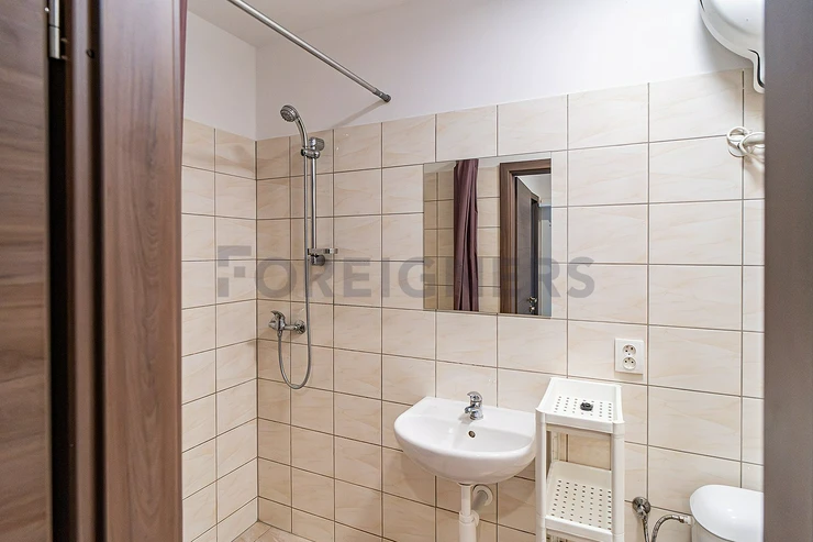 Upon entering to the apartments, we find ourselves in the main hall way which on the left leads to the bathroom with toilet. Continuing straight, there is main bedroom with kitchen corner. Windows are facing the direction of Poděbradská shopping area or the block of flats.
