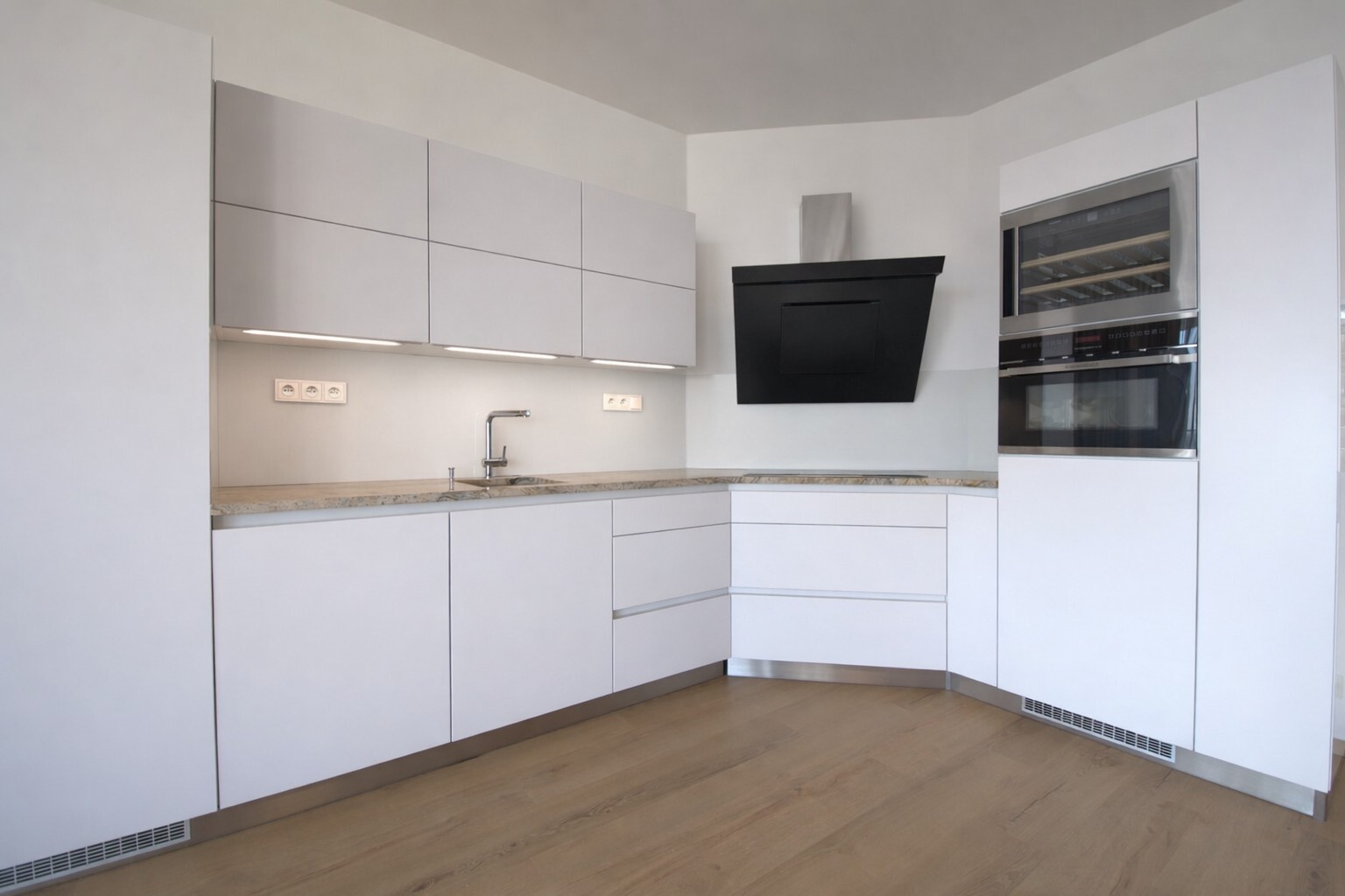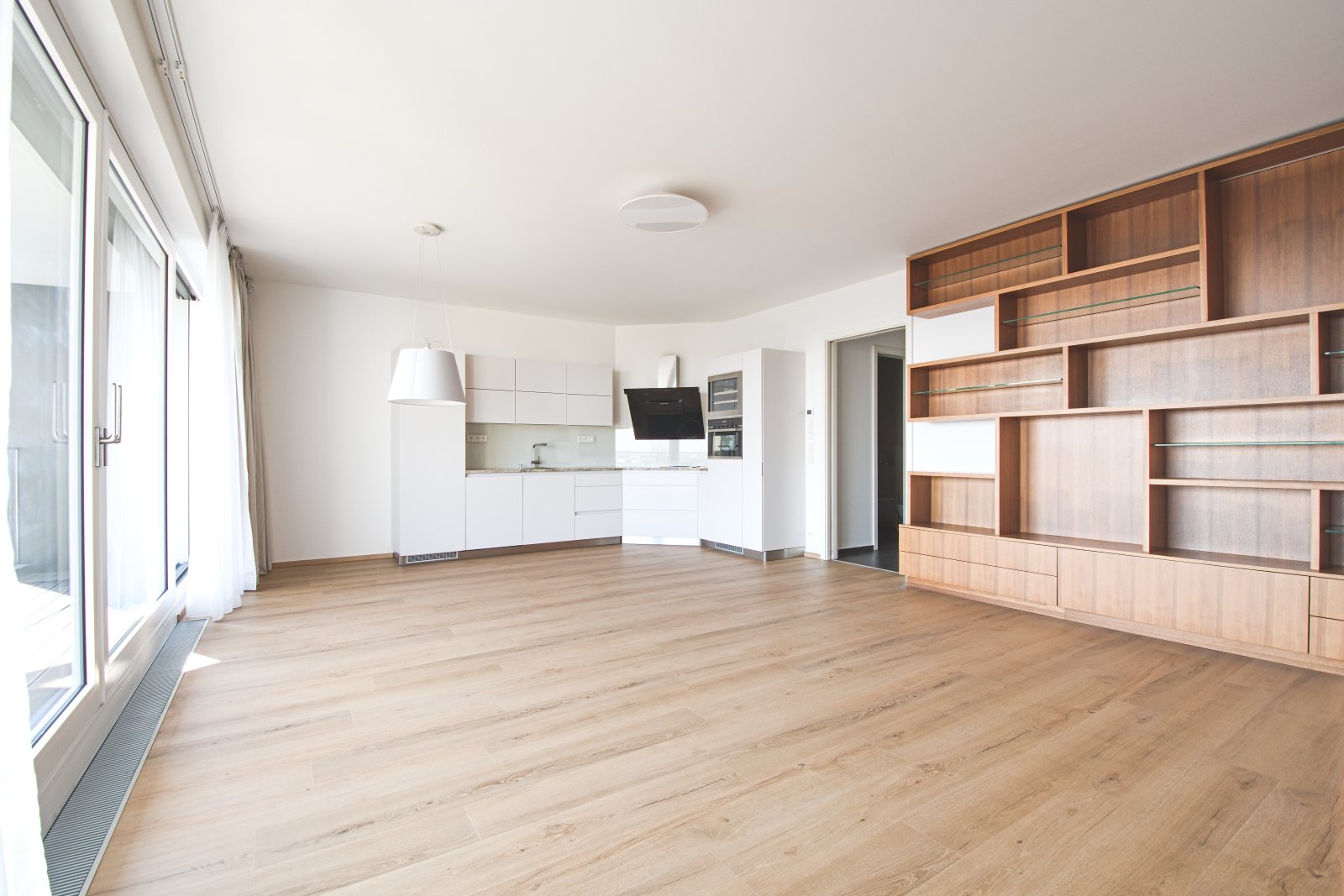 Both bedrooms have built-in wardrobes, and the living room is equipped with a designer shelving system. The modern kitchen is fully fitted with appliances, including a Küppersbusch hob with a wok system, a fridge with freezer, dishwasher, and oven.