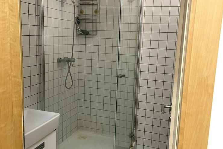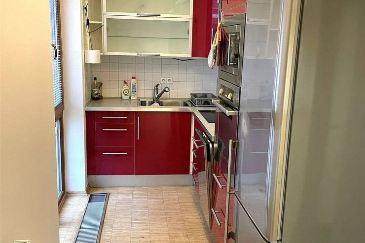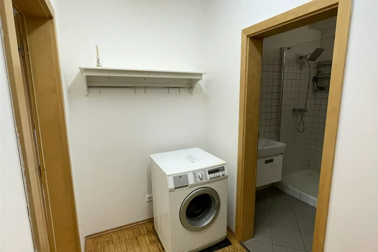 The apartment is very bright, with plenty of daylight thanks to the French windows in the room and the kitchenette. The apartment offers a entrance hall, a spacious room, a separate kitchenette, a bathroom and a separate toilet. The kitchen is equipped with a kitchen unit, a refrigerator with freezer, a ceramic hob, an electric and microwave oven, a dishwasher, and an extractor hood. The bathroom has a shower. There is a washing machine in the hallway. The floors are wooden combined with tiles.