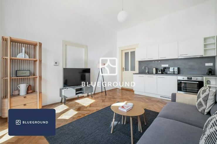 Looking for flexible living? Blueground offers fully furnished and equipped apartments for stays starting from 1 month. This bright 2+kk apartment (49 m²) is located in New Town, Prague 2, just 5 minutes from the popular Náplavka riverfront, one of the city’s most vibrant areas. Recently renovated, the apartment offers modern comfort, plenty of natural light, and a pleasant living environment in the very heart of Prague, with excellent access to culture, dining, and city life.