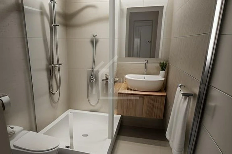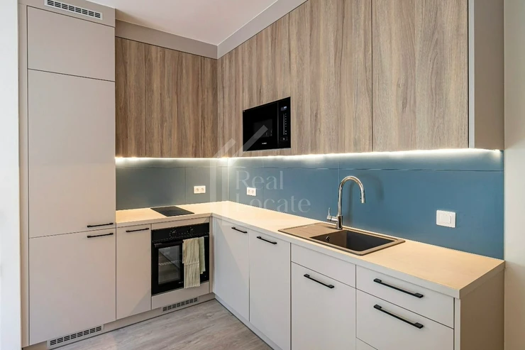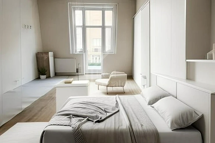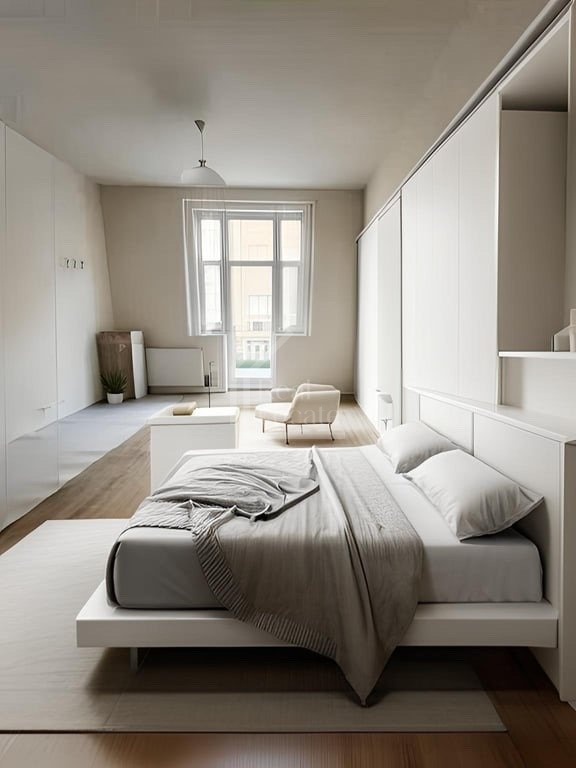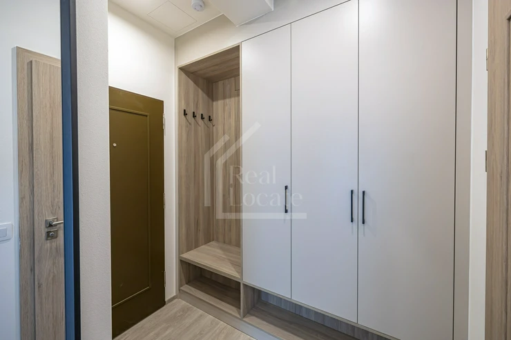 The apartment is fully furnished with custom-made modern furniture, crafted from high-quality materials. It features a bright living space, a spacious bathroom with a walk-in shower, and plenty of storage. The entire interior has been designed with a focus on functionality and design.