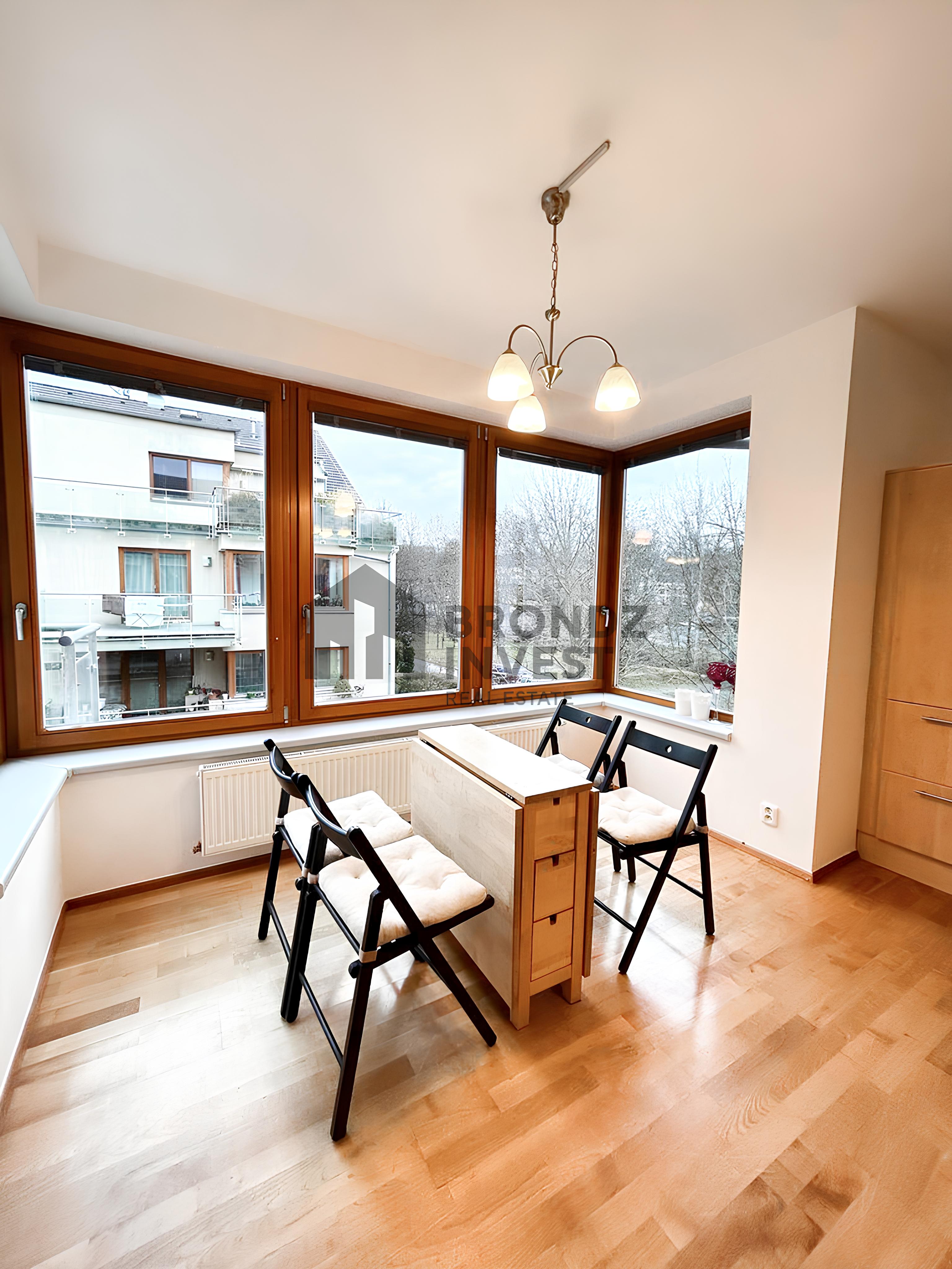 The 71 m² apartment is located in a smaller residential building in a quiet and green area near a park, ideal for walks and relaxation. The Pod Taborem tram stop is within walking distance.