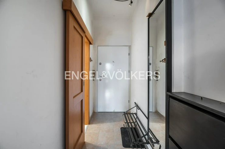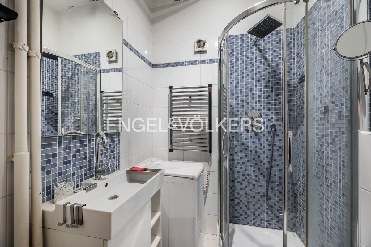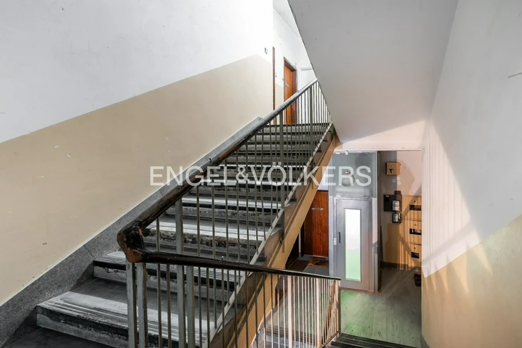 This studio apartment is located on the elevated ground floor of a well-maintained apartment building on U Pergamenky Street. One of the advantages of this apartment is the sleeping loft. The living room with the kitchen is equipped with storage space.