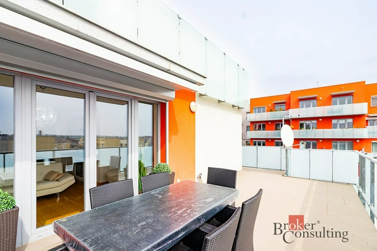 Dispozice bytu zahrnuje obývací pokoj s kuchyňským koutem, dvě samostatné ložnice, koupelnu a samostatné WC. Velkou předností je prostorná terasa ideální pro relaxaci i posezení s přáteli, a navíc menší terasa, která poskytuje další venkovní prostor.