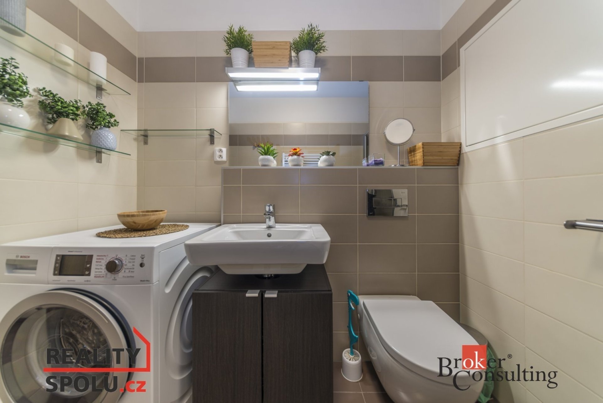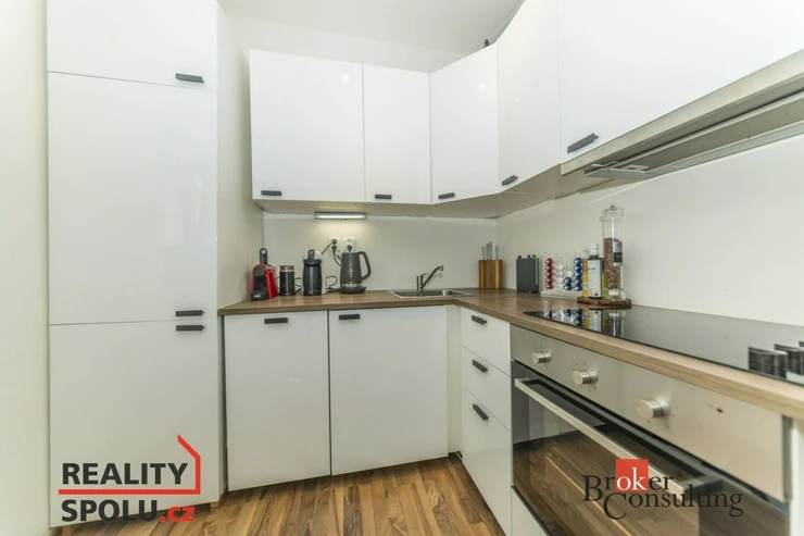 Byt se pronajímá s vybavením zachyceným na fotografiích, tedy včetně postele, TV stolku a skříní. Vestavěná kuchyň je vybavená indukční deskou, lednicí a mrazákem. V celém bytě je plovoucí podlaha, v koupelně dlažba.