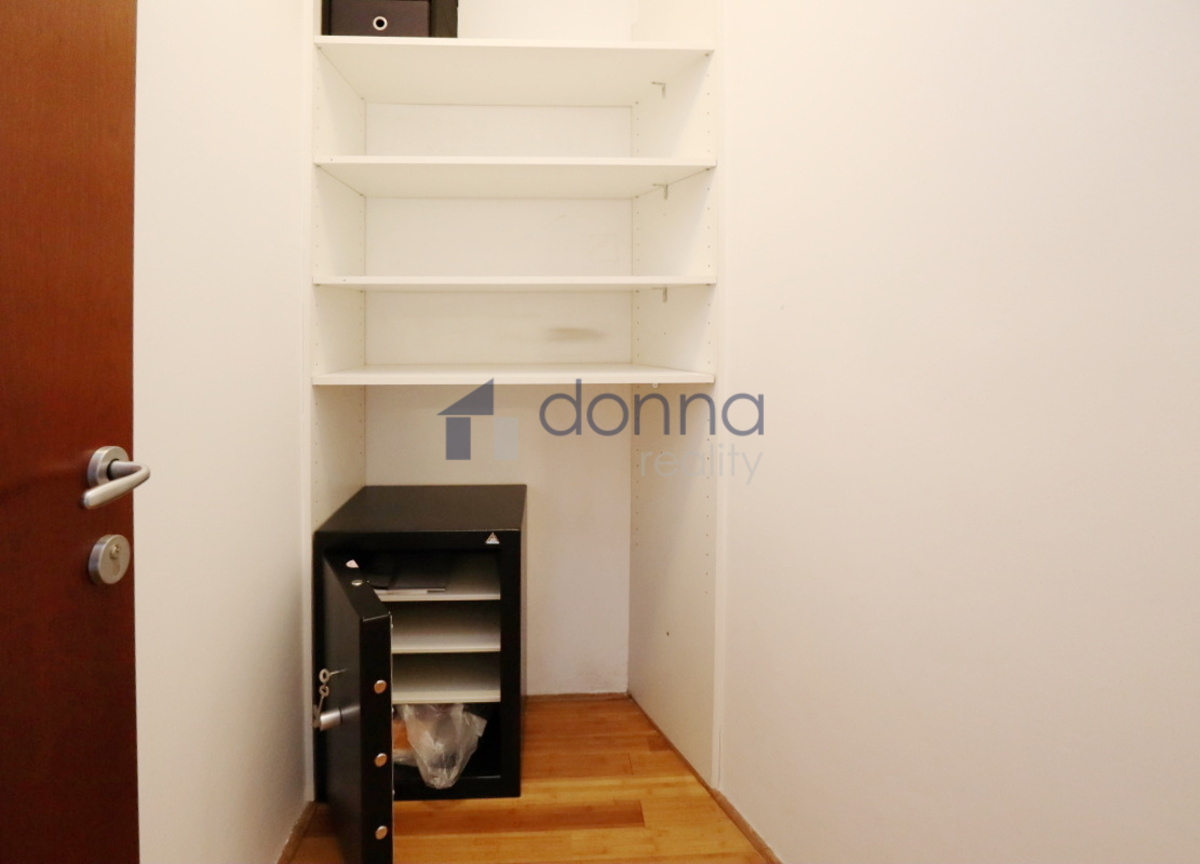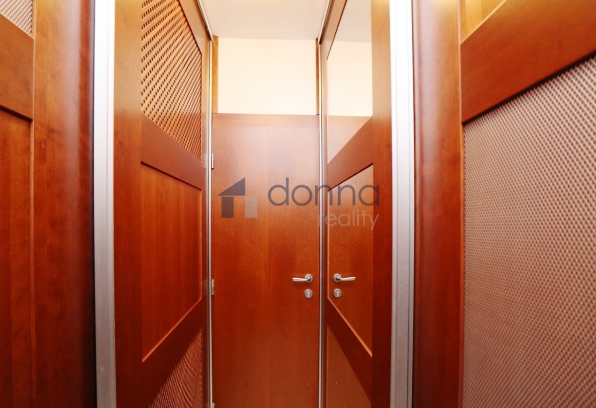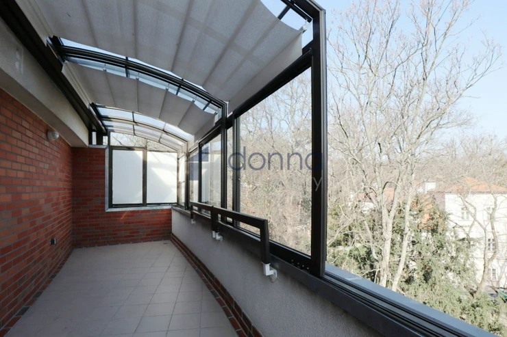 Apartment for rent a 2+kt, 82sqm, with 2 terraces (17sqm and 10sqm) on the top floor of a residential building with a 24/7 reception desk and a shared garden for the residents of the building, in U Nikolajky street, Prague 5 - Smíchov. The apartment is fully furnished and consists of an entrance hall, a dressing room, a large bedroom with access to one terrace, a bathroom with a corner bath and shower and washing machine, a spacious living room with a kitchenette and a storage room with a safe. The toilet is separate. The living room leads to the second terrace. Both terraces have an opening roof. The kitchen has a fridge with freezer, dishwasher, microwave, electric hob and extractor hood. Heating and water heating are central. The floors are wooden parquets and tiles. There are external blinds on the windows. It is also possible to rent a garage space with the apartment. The house is located in a quiet part of Smíchov.