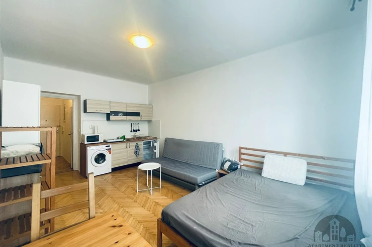 We offer for rent a furnished 1kk apartment on the 5th floor of a functionalist building in Karlín. The location is Křižíkova street, near Křižíkova metro station. The apartment's area is approximately 30 m2 + a balcony with a view of Rohanské nábřeží. The apartment is fully furnished with furniture (bed, armchairs, table, chairs, wardrobes, etc.), a kitchenette including a refrigerator, microwave, kettle, washing machine. It is also equipped with all small furnishings such as mattresses, pillows, blankets, bed linen, kitchenware. For up to 2 people. Available from now.