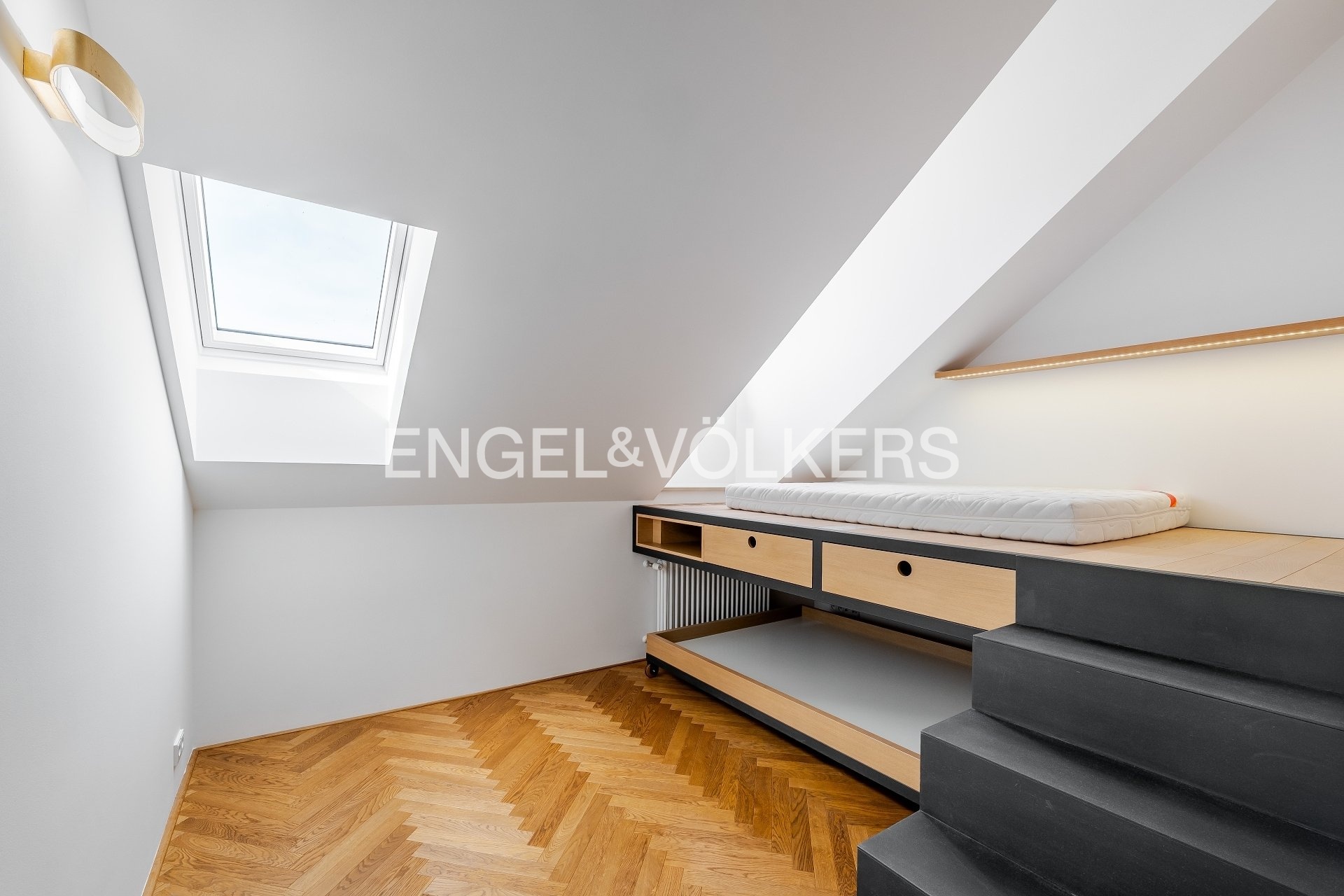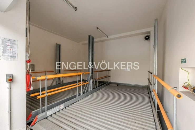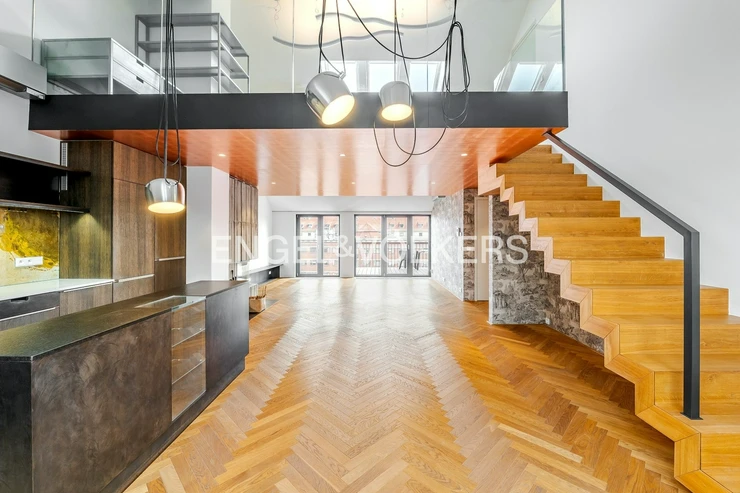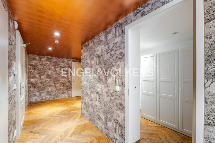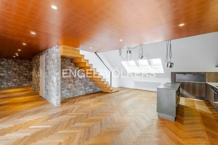 The apartment also includes a 9.5 m² terrace, a basement storage unit, and two parking spaces in a garage with a stacking system. The apartment is equipped with air conditioning, and the skylights are electrically operated. The interior has an elegant feel thanks to the hardwood floors and stylish wallpapers. The apartment’s security is ensured by an alarm system.