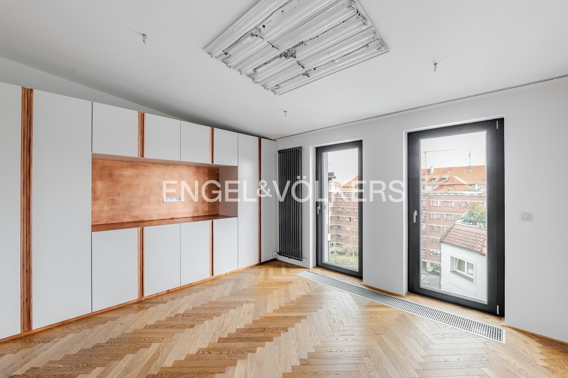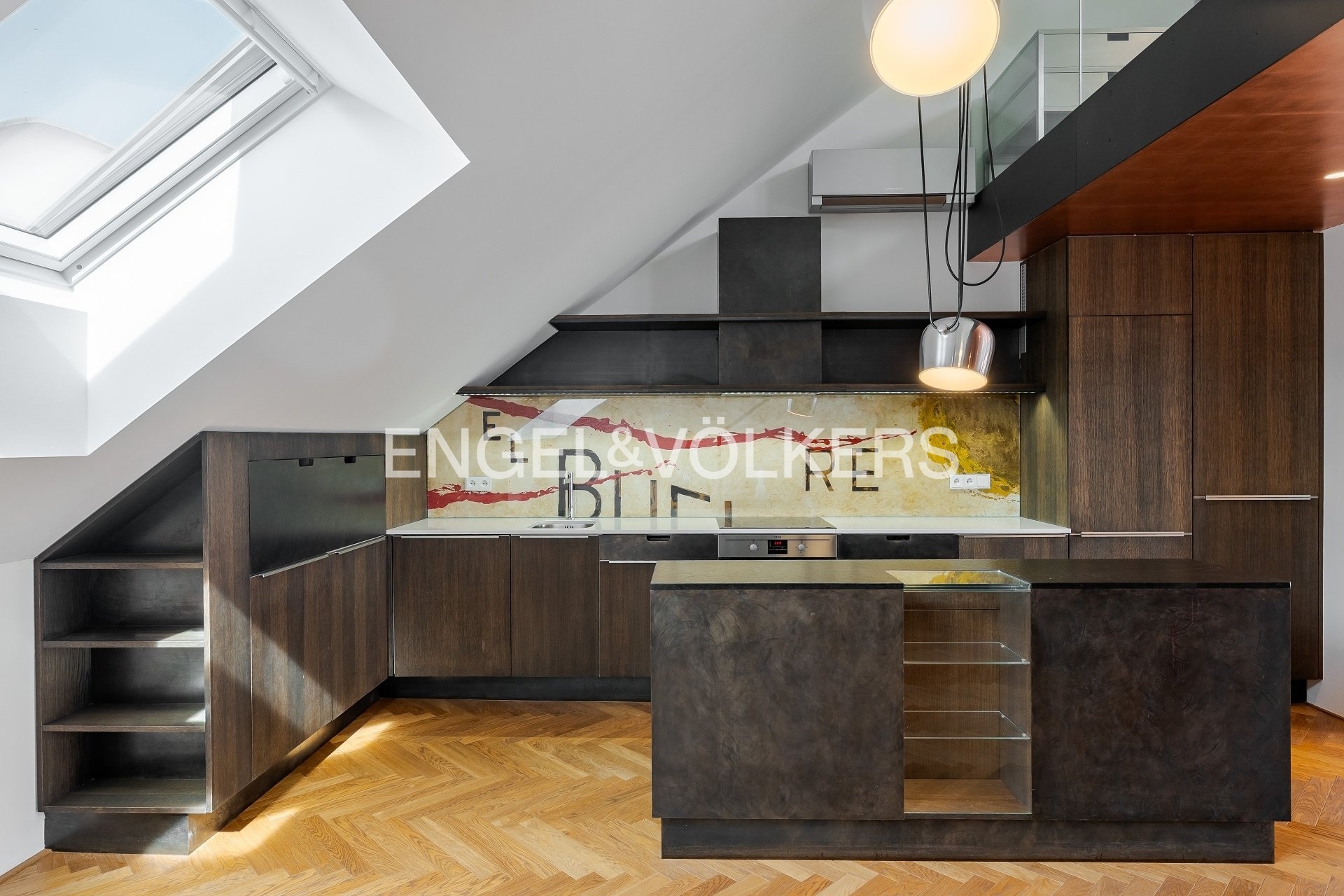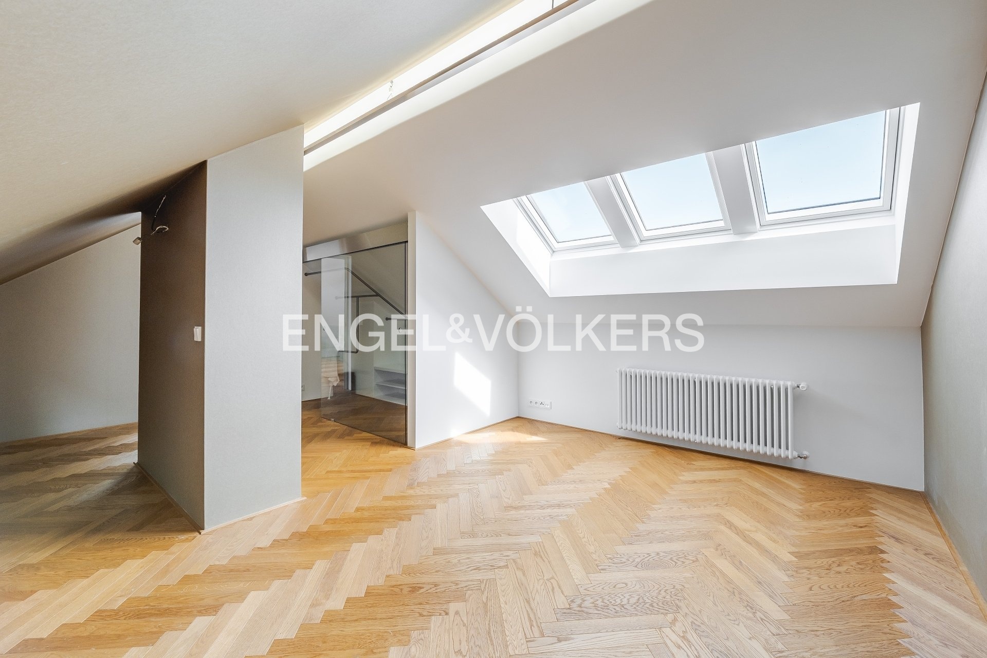 The apartment also includes a 9.5 m² terrace, a basement storage unit, and two parking spaces in a garage with a stacking system. The apartment is equipped with air conditioning, and the skylights are electrically operated. The interior has an elegant feel thanks to the hardwood floors and stylish wallpapers. The apartment’s security is ensured by an alarm system.