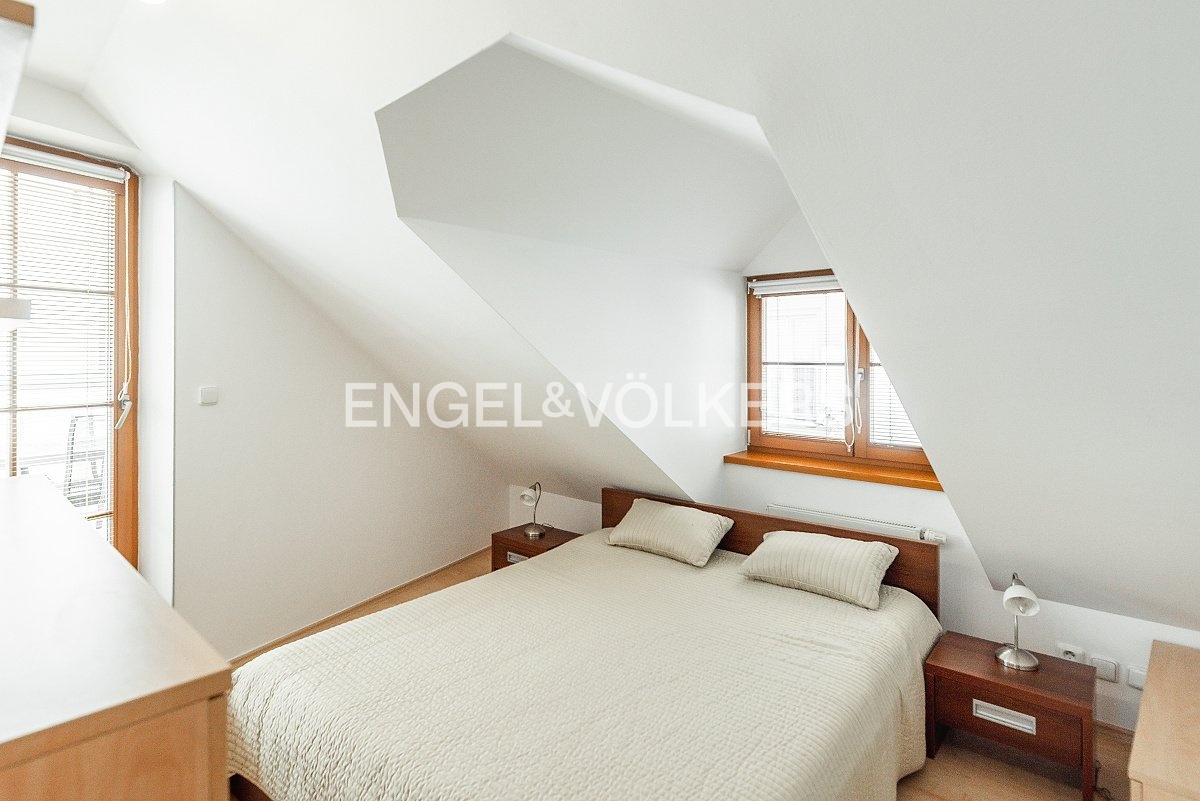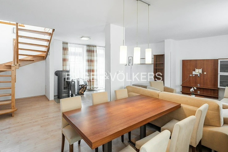 The heart of the apartment is a spacious living room with a fireplace and a fully equipped kitchenette. Stairs lead up to a fully furnished upper floor, where you’ll find a bedroom, a study that can be converted into a children’s room, and even a large private bathroom with a bathtub. The apartment also features a terrace with seating, where you can enjoy the sun and tranquillity, as it faces the courtyard. The lower level includes a practical walk-in closet, a second bathroom, and a utility room.