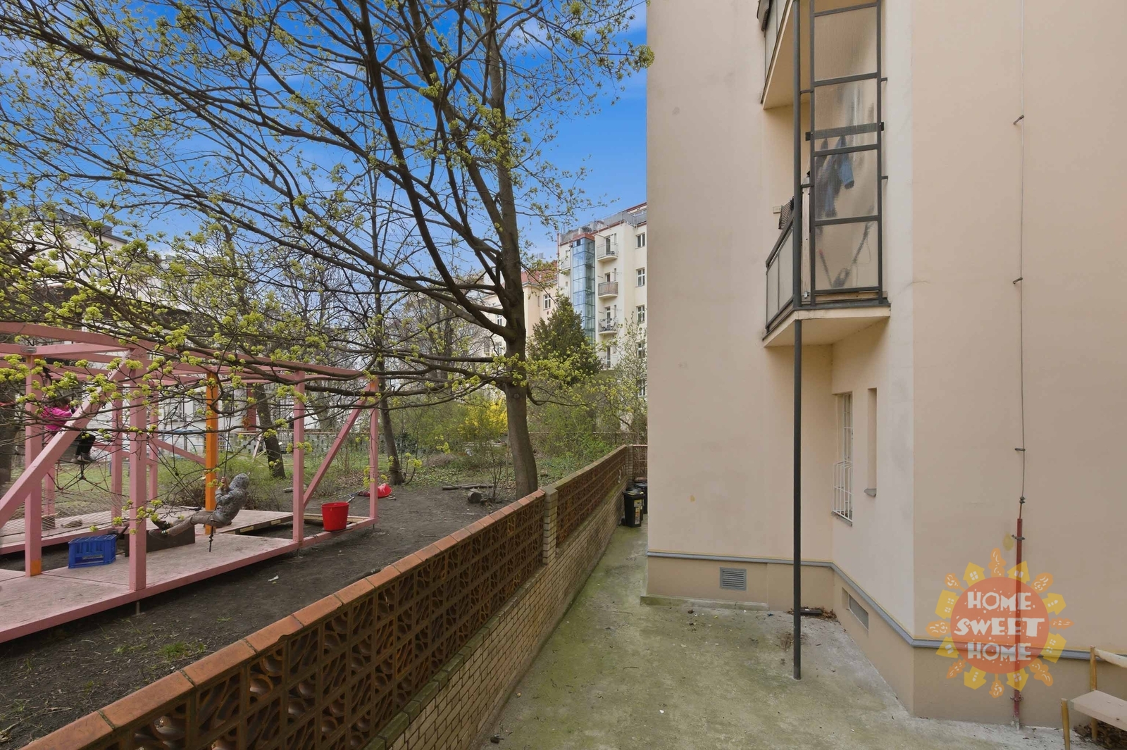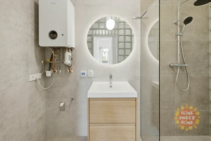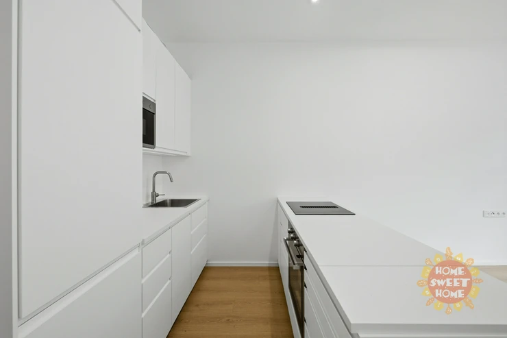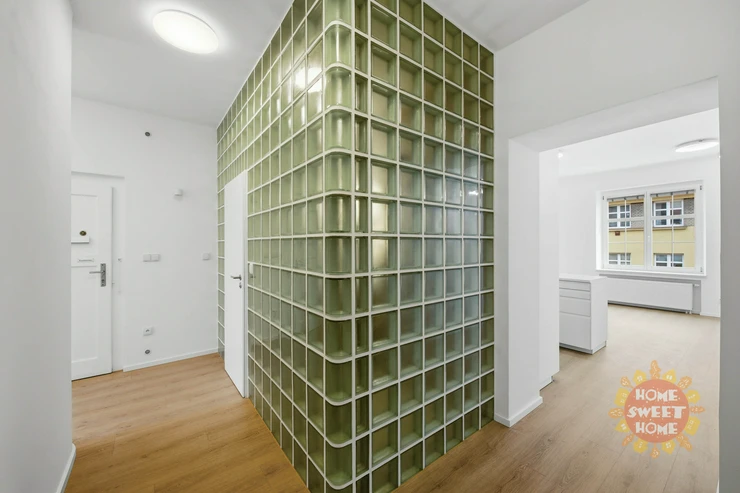 The apartment is available unfurnished and consists of an entryway with access to the balcony, which faces a quiet courtyard, ensuring a pleasant and quiet environment. The living area features a new kitchen equipped with new appliances, including an oven, a glass-ceramic cooktop, a refrigerator with a freezer, and a dishwasher. The bedroom also faces the quiet courtyard. The bathroom is modernly partitioned with glass blocks that allow plenty of natural light. The bathroom features a modern shower stall, a gas boiler providing heating and hot water, and a connection for a washing machine. The toilet is separate, which enhances the overall comfort of the apartment.