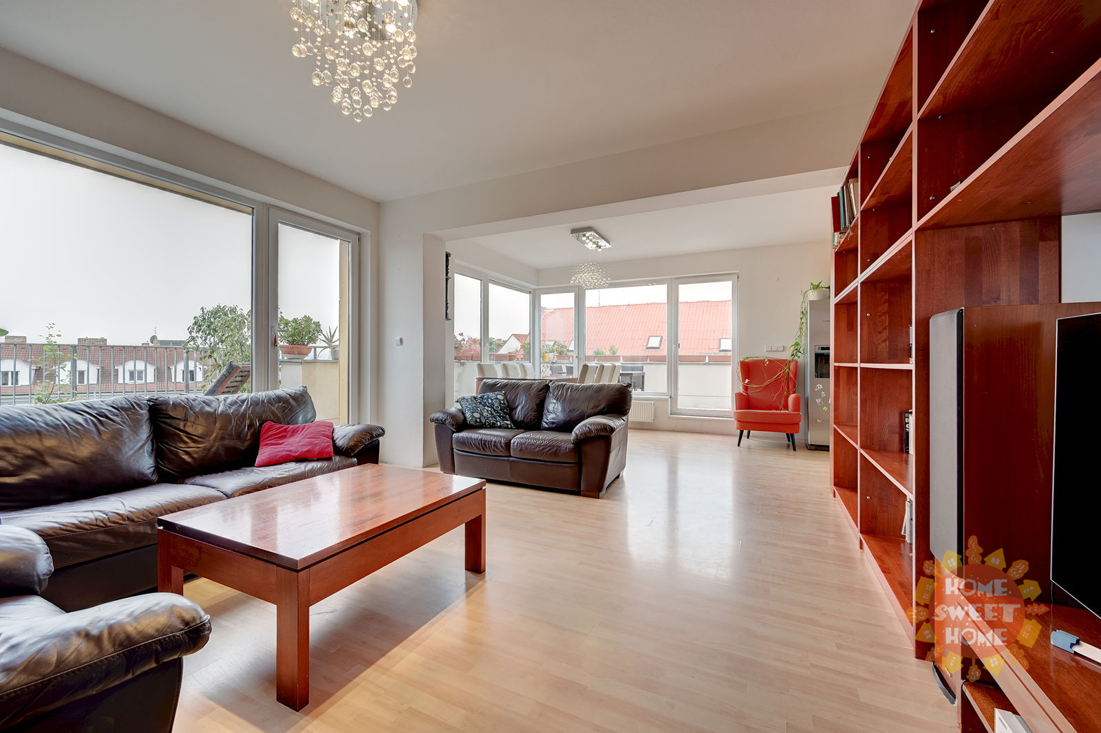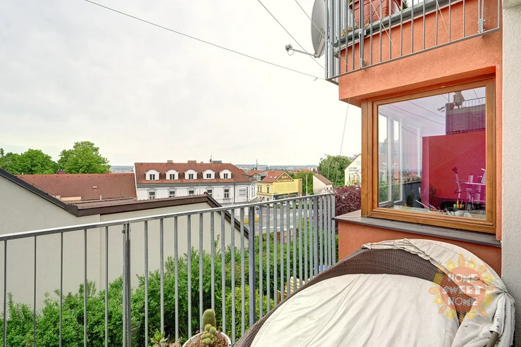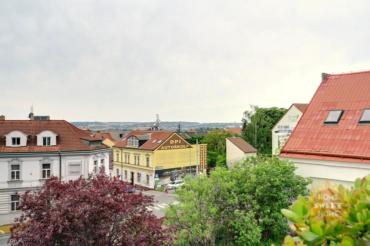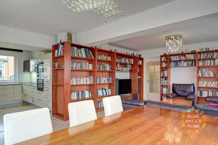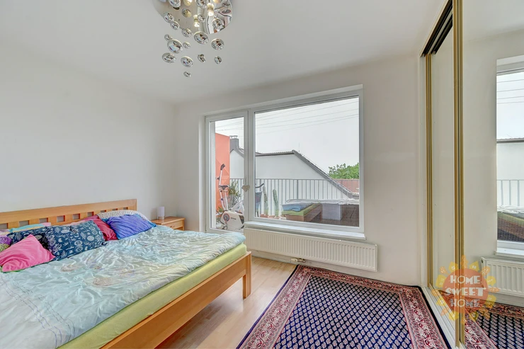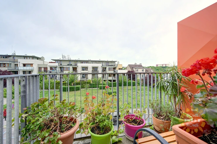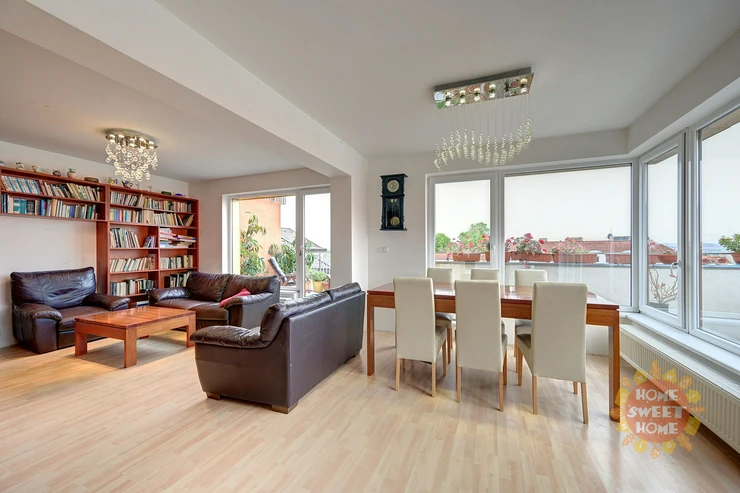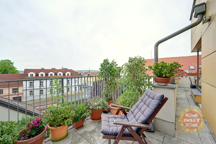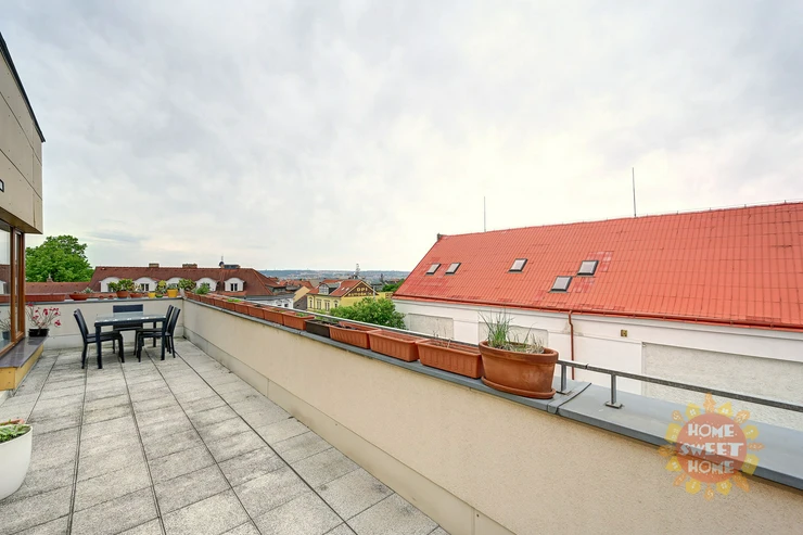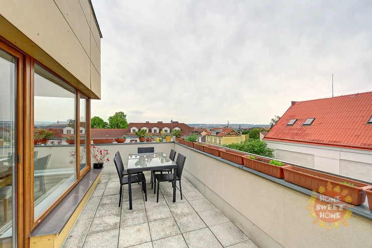 The apartment consists of an entrance hall, a spacious living room with dining area and kitchen and four other rooms. All rooms are impassable, making the apartment very practical. From the living room there are three entrances to a spacious terrace overlooking the panorama of Prague and Prague Castle. The apartment also offers three separate rooms, one of them with a balcony, and a master bedroom (fourth room) with a private bathroom with shower and toilet and access to the second terrace. The apartment also has a bathroom with bath and another separate toilet. There is also a chamber with a washer and dryer in the hallway. Kitchen with elements of solid wood and stone worktop offers plenty storage space and is fully equipped with built-in high-quality Siemens appliances - induction electric stove with ceramic hob, electric oven with steam baking and electronic recipes, another separate microwave and large dishwasher; there is also an American fridge in the kitchen, which provides enough space for a larger family. The apartment has its own heating with a new automatic gas boiler Viessmann with equithermal regulation and thanks to its southern orientation is very energy efficient.