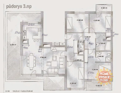 Beautiful sunny apartment 5+kt for rent, situated in a quiet part of Prague 8 - Kobylisy, Na Hlinách street. Spacious and interestingly designed apartment is located on the 2nd floor of a new building from 2009 with an elevator. Its great advantages are generous terraces and balconies: spacious south and west terrace with nice views of Prague (42.21 sqm), another south terrace (6.24 sqm) and balcony (3 sqm). Total area of 177.73 sqm. The lease also includes a garage parking space and a cellar. Parking is possible also behind the barrier next to the house.