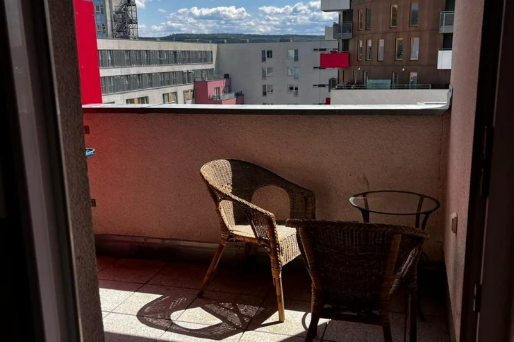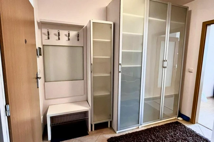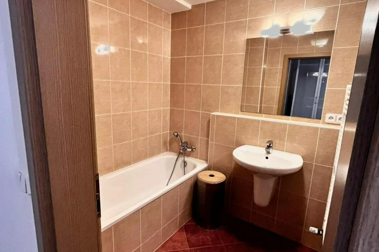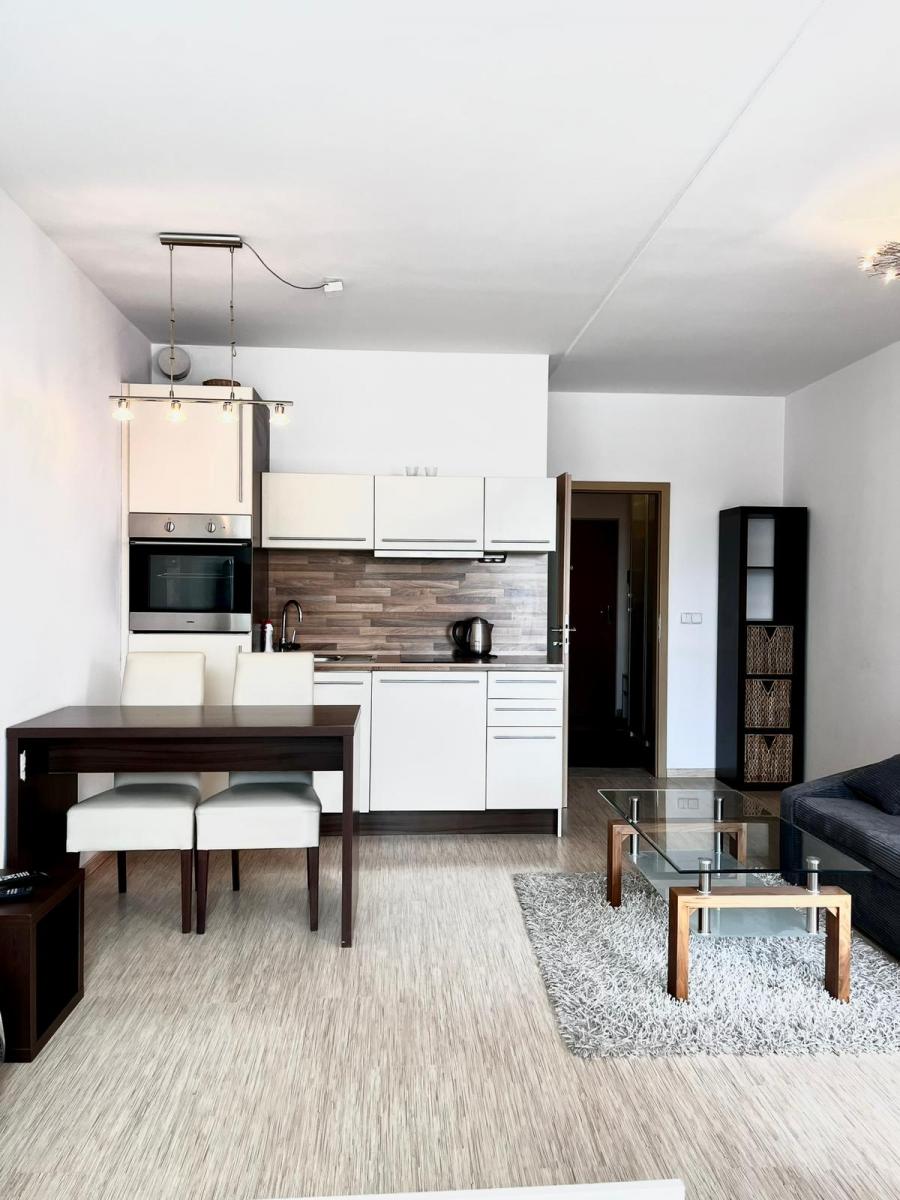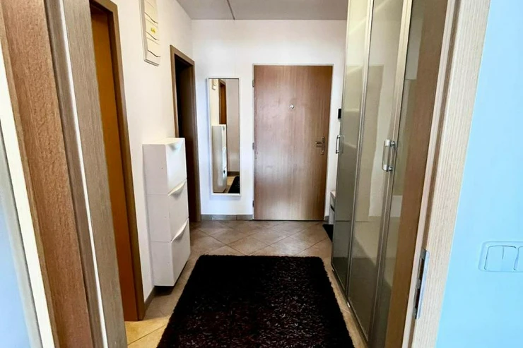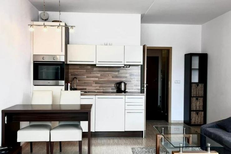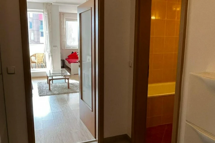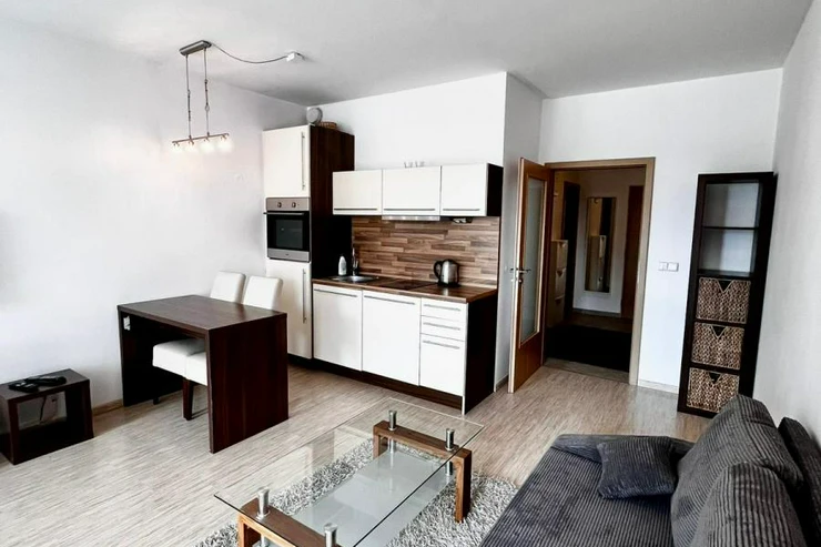 The apartment is currently being upgraded a partition wall is being installed between the sleeping and living area (creating a semi 2+kk layout), along with kitchen adjustments and bathroom improvements (new sink with cabinet, shower screen, new washer-dryer).