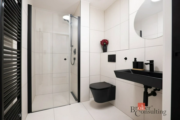 Koupelna: Moderní design se sprchovým koutem a toaletou.