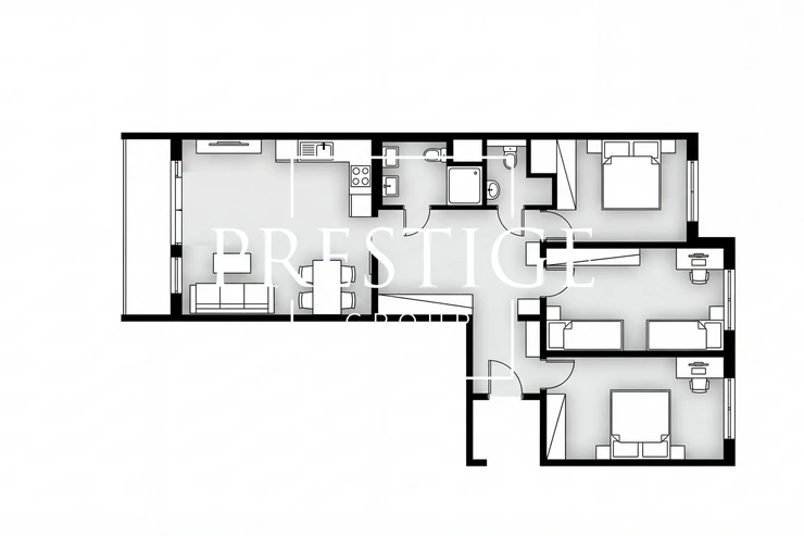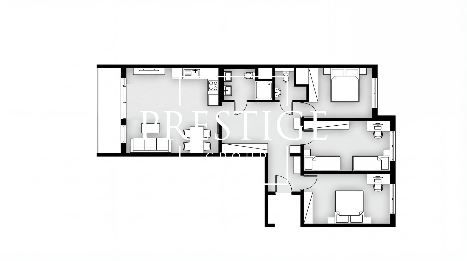 The living area consists of a sunny room with direct access to the loggia and a fully equipped kitchen unit with all appliances. Each bedroom is accessible from the hallway.