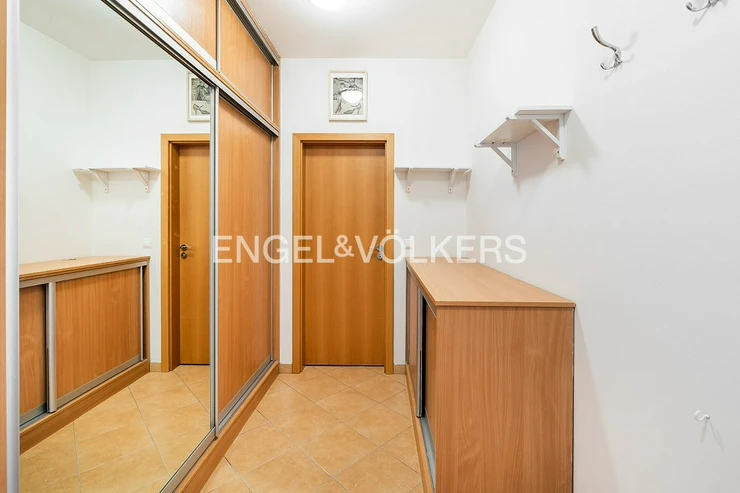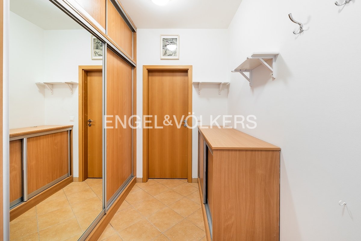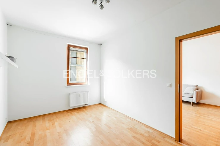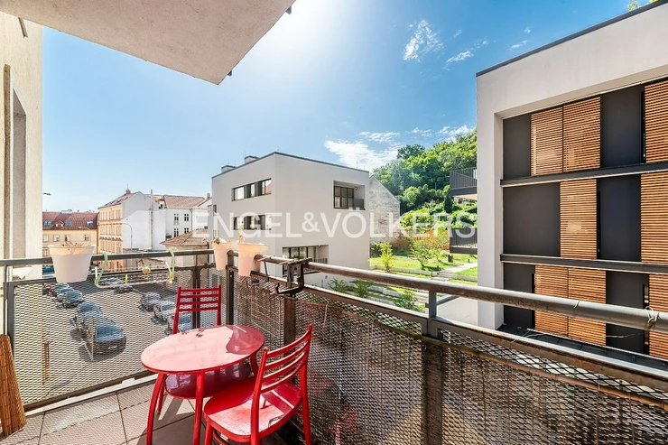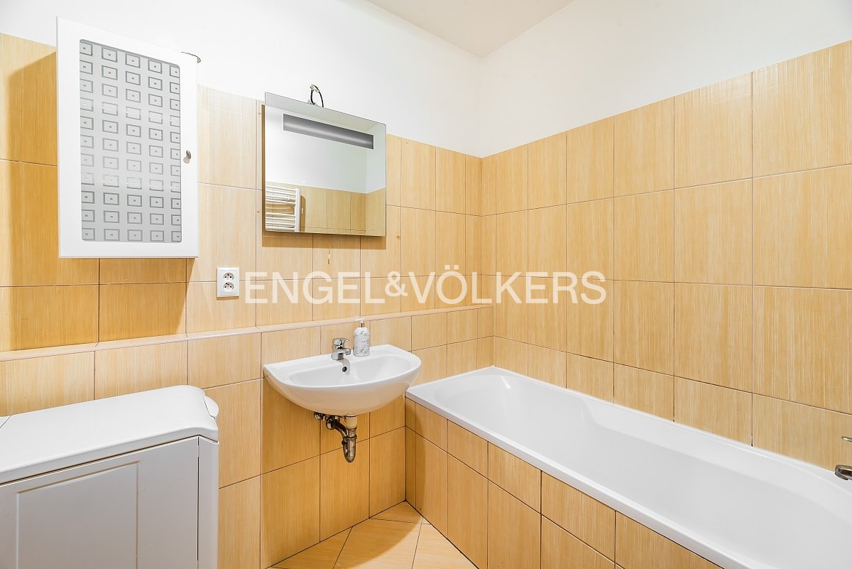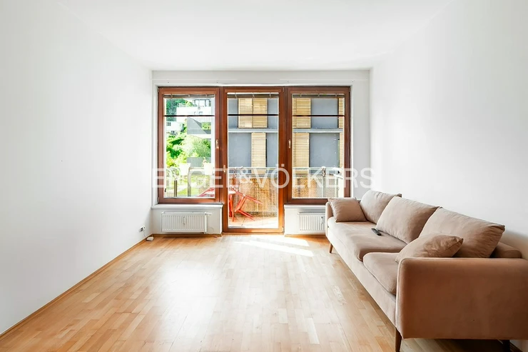The apartment is located on the third floor of a newly built complex from the 2008 within walking distance from Radlická metro station and only 3 minutes by foot to the nearest tram stop. You can reach Anděl within 12 minutes. The street is quiet and is surrounded by Kesnerka Park. The living room with an entrance to the balcony is divided by a bar table from the kitchenette, which is equipped with basic appliances. There is a spacious built-in wardrobe in the bedroom, as well as in the hallway. The apartment is partly furnished including a double bed, writing desk, conference table, TV table and chest of drawers. In the bathroom there is a bathtub, washing machine and a toilet. The price includes water delivery and water heating, the apt. heating and house services. You can rent a garage parking space for 1500 CZK per month. There is a lift in the house, the price includes a cellar.