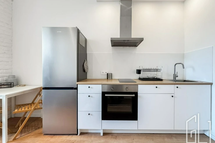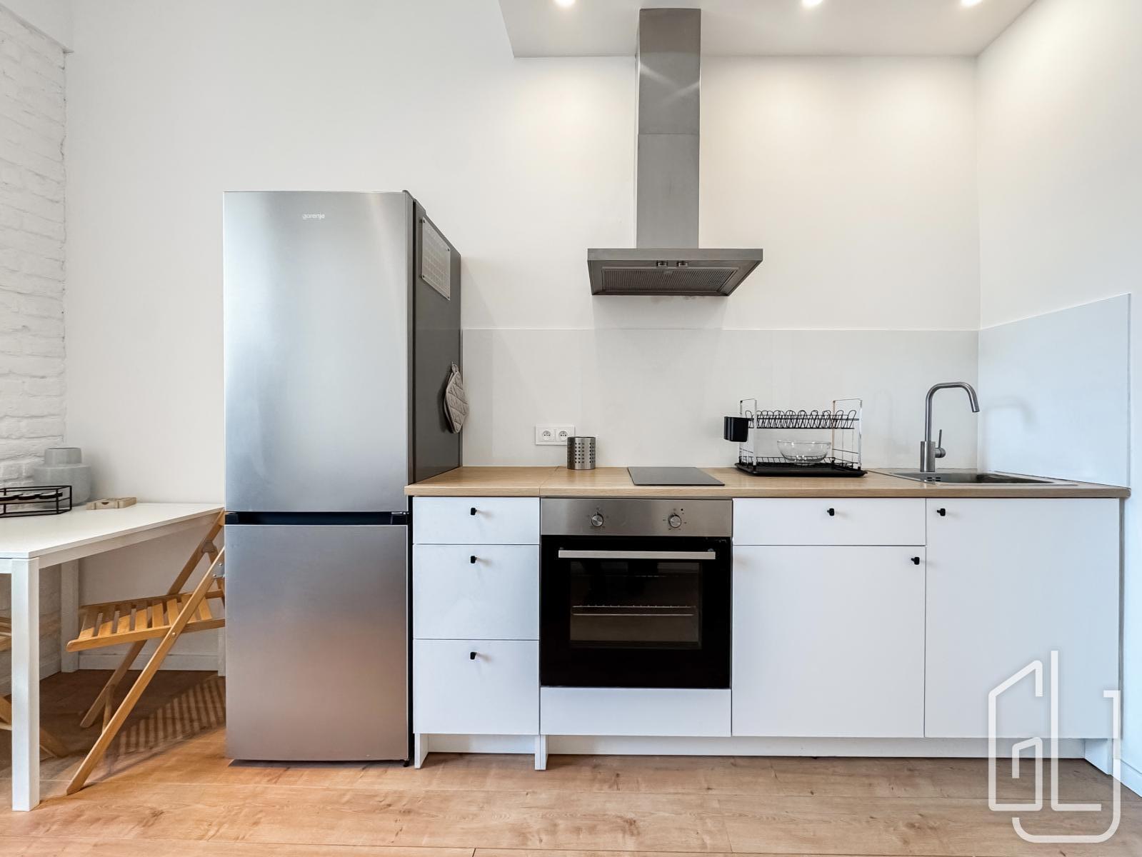Dispozice zahrnuje obývací pokoj s kuchyňským koutem, který je vybaven sedací soupravou, jídelním stolem a pracovní zónou. Kuchyň plně vybavená, disponuje vestavěnými spotřebiči a poskytuje dostatek prostoru pro každodenní vaření i stolování.