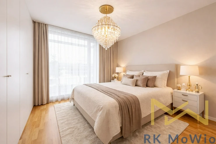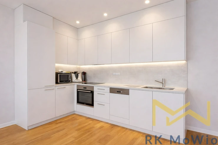 The apartment is equipped with a kitchen unit including appliances (fridge with freezer, hob, electric oven, dishwasher, microwave), built-in wardrobes, a washing machine, preparation for high-speed internet, wooden floors, and tiles. The interior is fully furnished and ready for immediate move-in. A cellar is included, and a parking space is available for an additional fee.