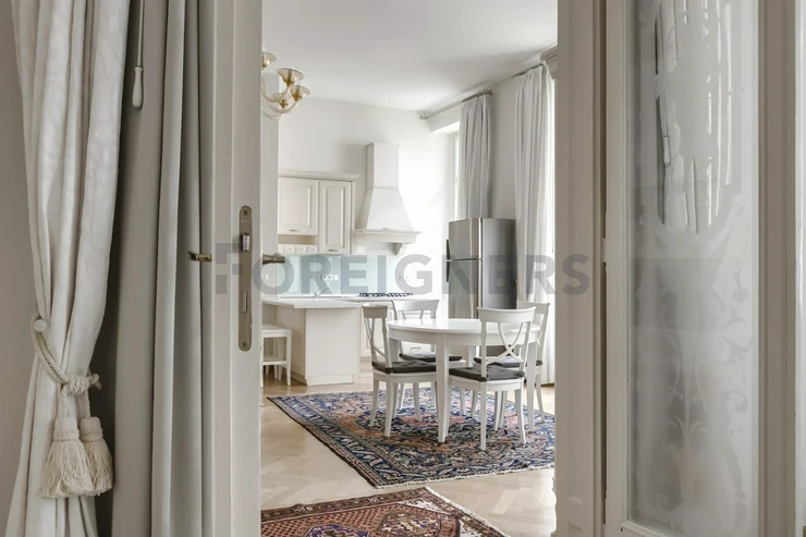 The interior is furnished with high-quality and stylish Italian furniture. The dining area features a fully equipped, custom-made kitchen, dining table with chairs, display cabinet, and a large chest of drawers, all made of solid wood with a glossy finish. The living room is also furnished with solid wood furniture and a sofa. The bedroom offers a double bed and ample storage space thanks to a large built-in wardrobe. The bathroom is equipped with a bathtub, two sinks, and a washing machine. All rooms have wooden parquet flooring, while the bathroom is tiled.