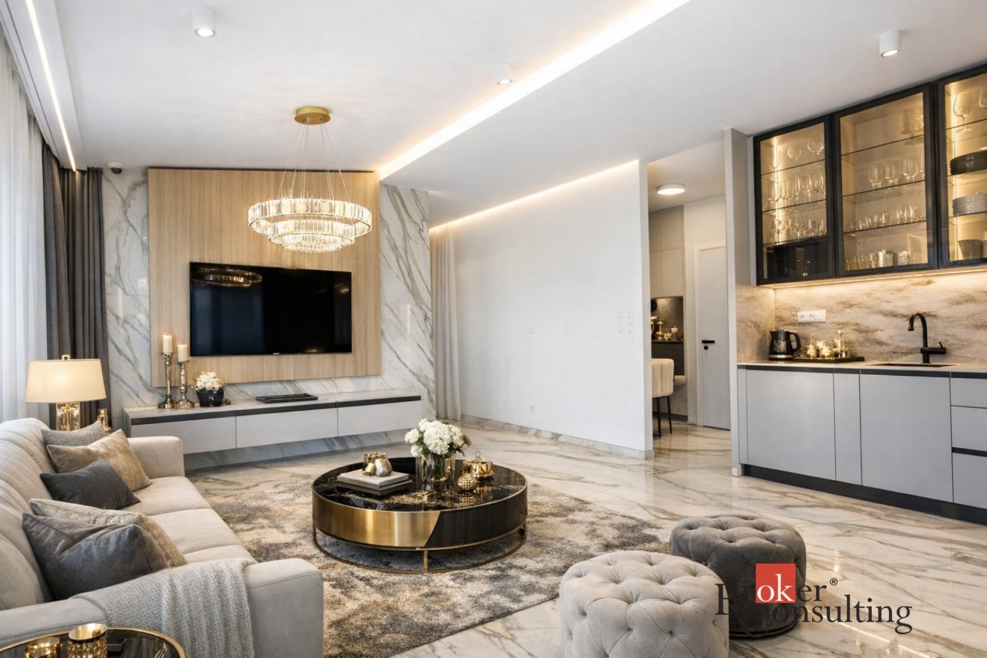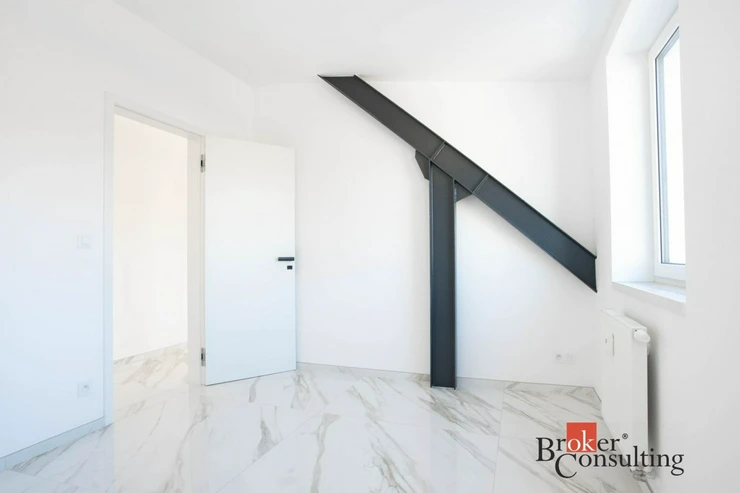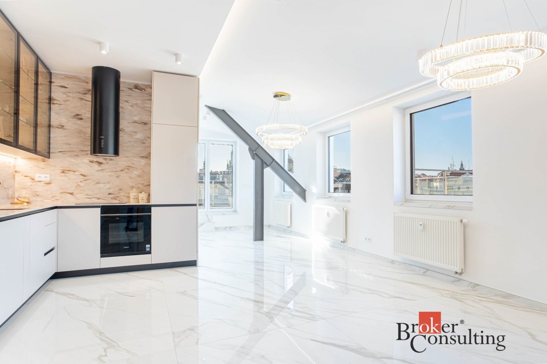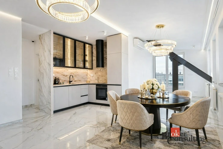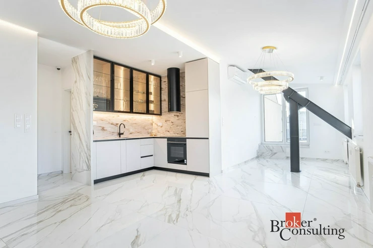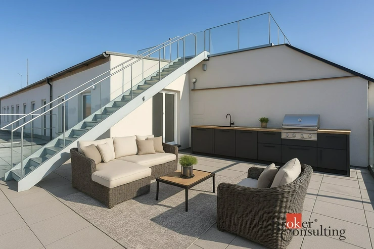 Hlavní částí bytu je velká, prosvětlená obývací místnost propojená s moderní kuchyňskou linkou vybavenou kvalitními spotřebiči. Z obývacího prostoru se vstupuje na soukromou terasu situovanou v horním patře, která poskytuje ideální místo pro relaxaci nebo posezení s přáteli a nabízí krásný výhled na centrum města.