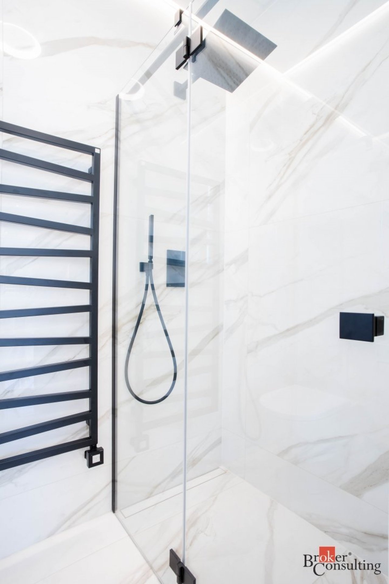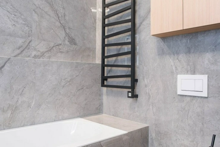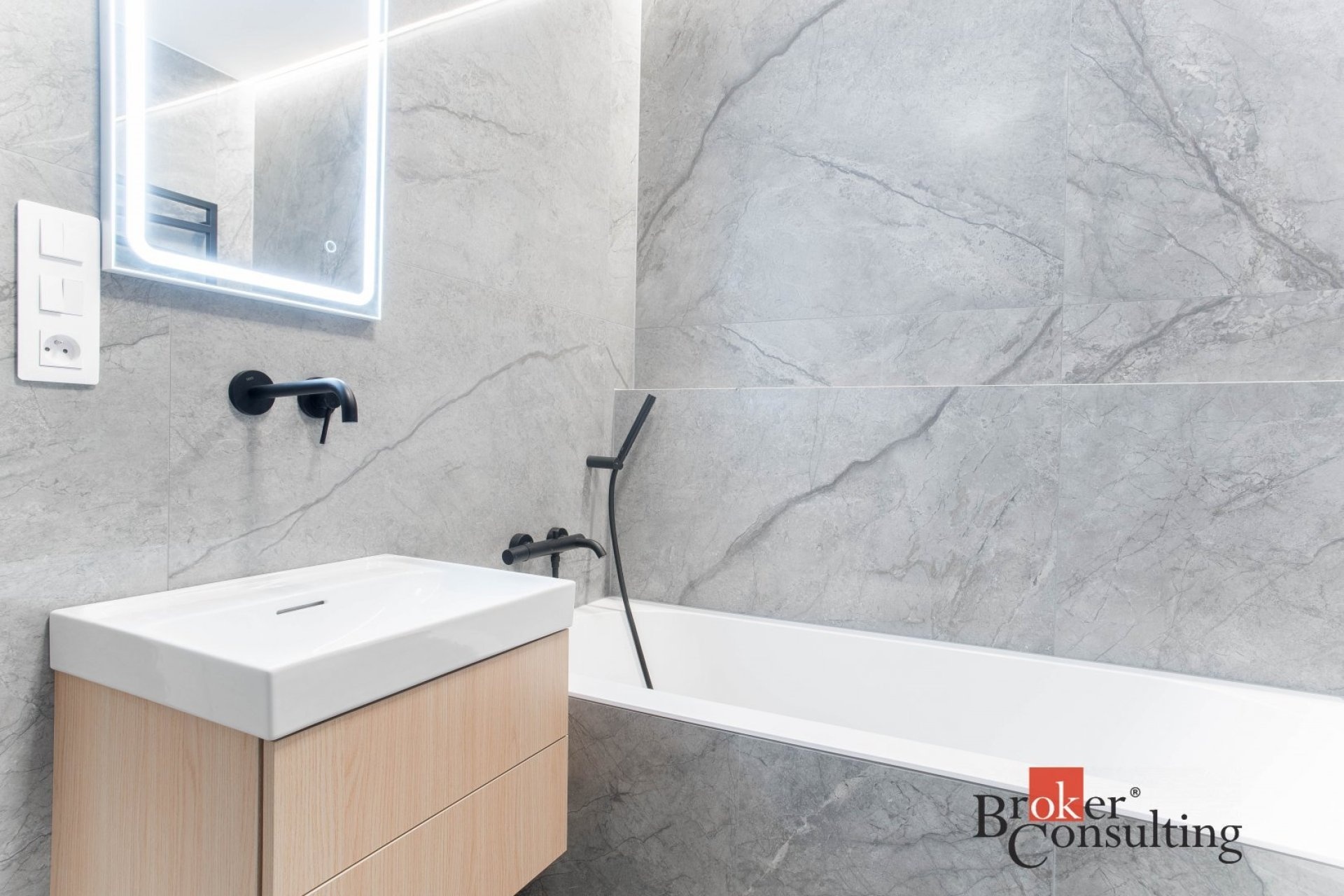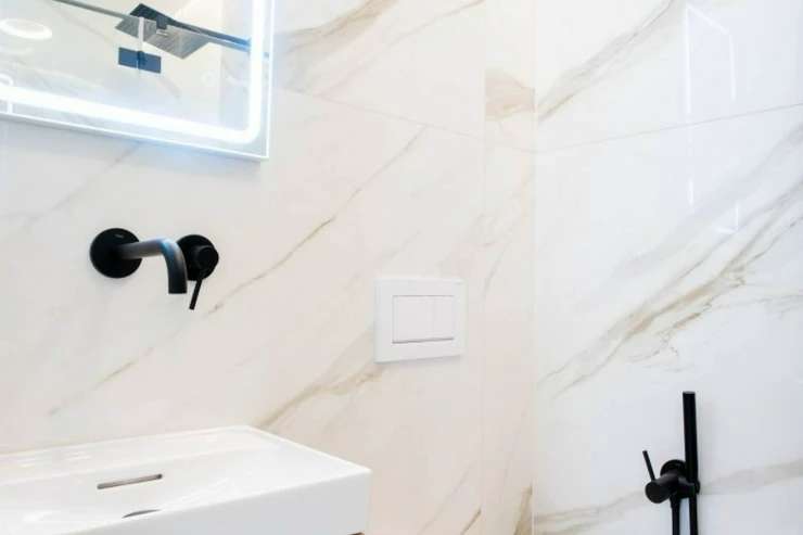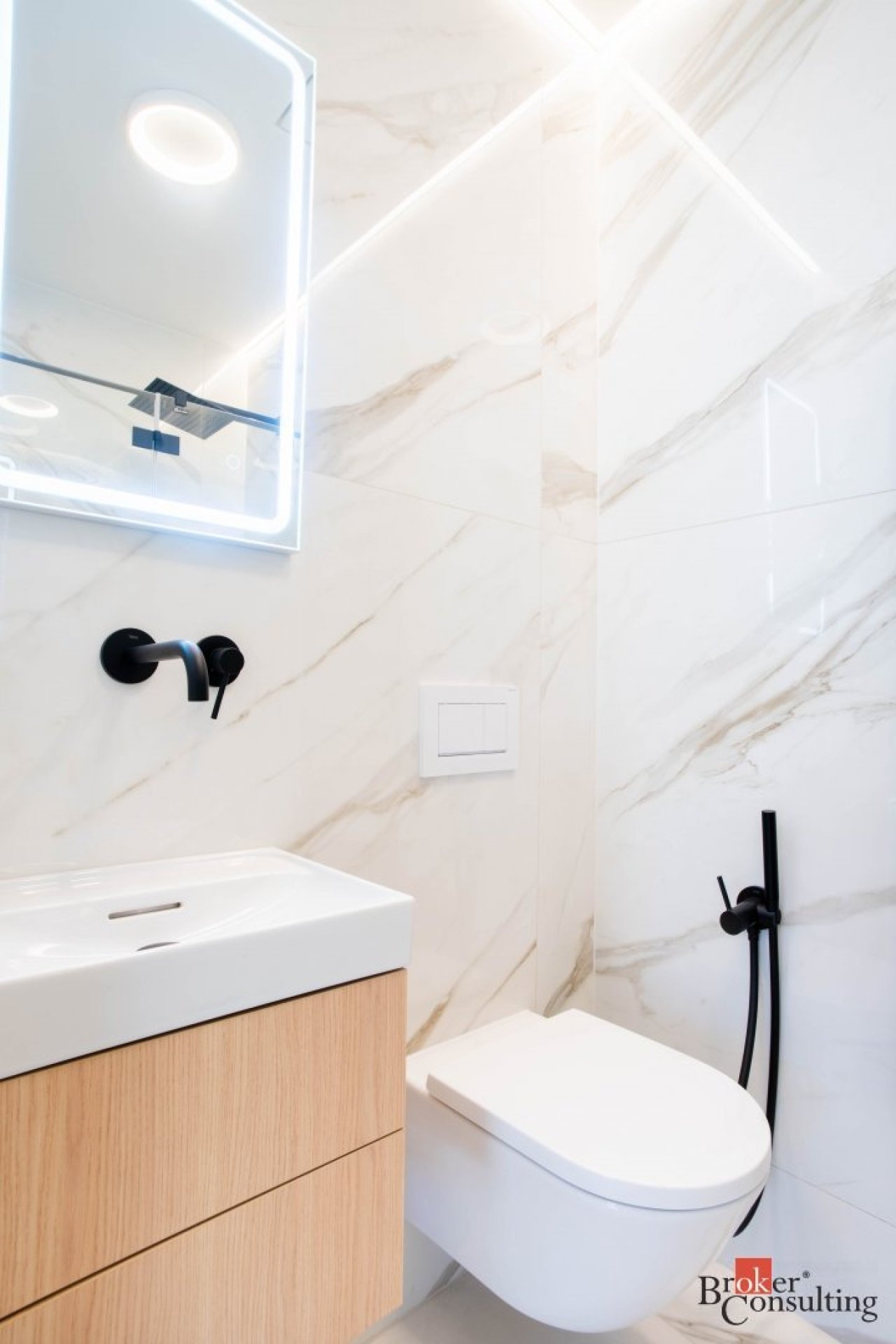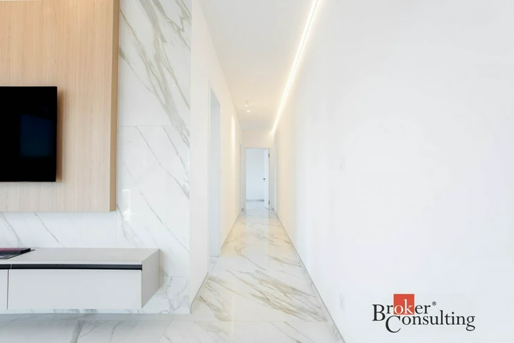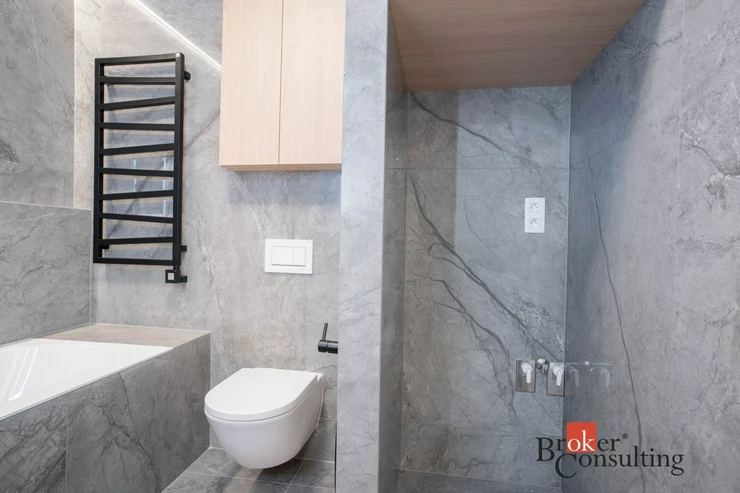 V bytě se nacházejí dvě designové koupelny – jedna vybavená prostornou vanou a toaletou a druhá se sprchovým koutem a taktéž s toaletou. Elegantní chodba s efektním kulatým zrcadlem dotváří luxusní atmosféru celého interiéru a poskytuje dostatek prostoru a úložných možností.