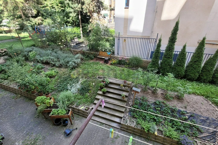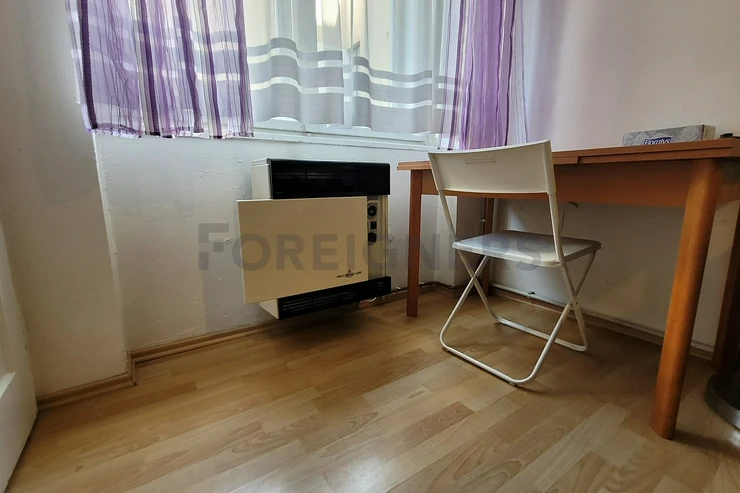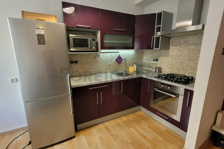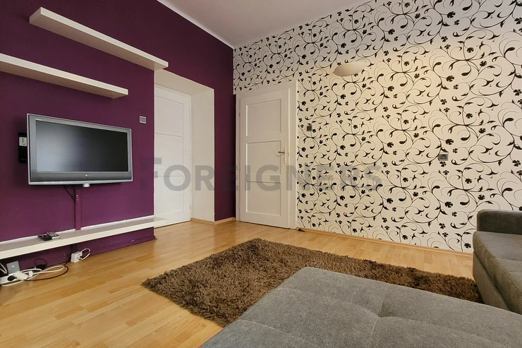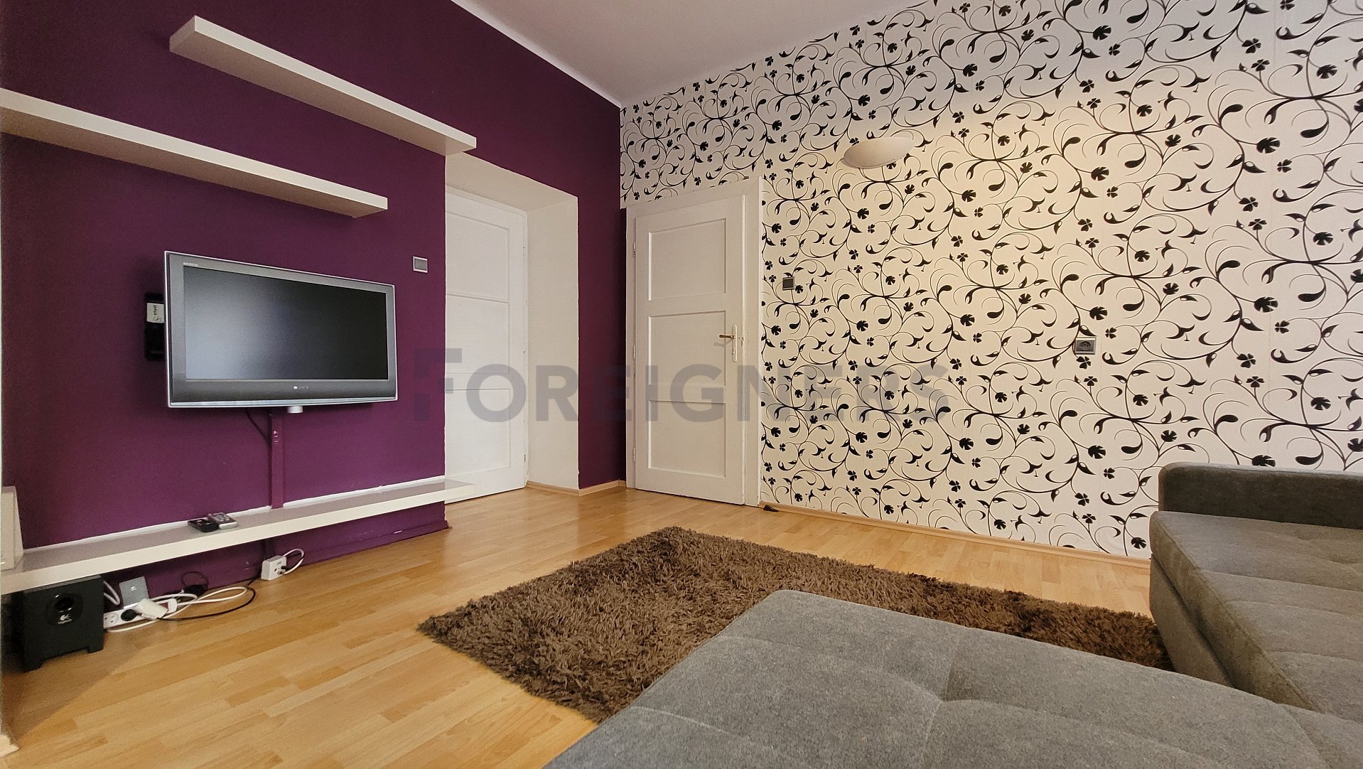 The apartment is fully furnished. The flat consists of a living area (big sofa bed, dining table with chairs, tv table and TV), kitchen unit has a stove, oven, hood, fridge with a freezer and microwave. The bedroom is equipped with a double bed, bedside tables, a wardrobe, a bookcase and the entrance to the balcony. The bathroom has a bathtub, toilet, sink and washing machine. There is a cellar in the house.