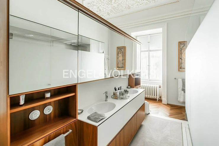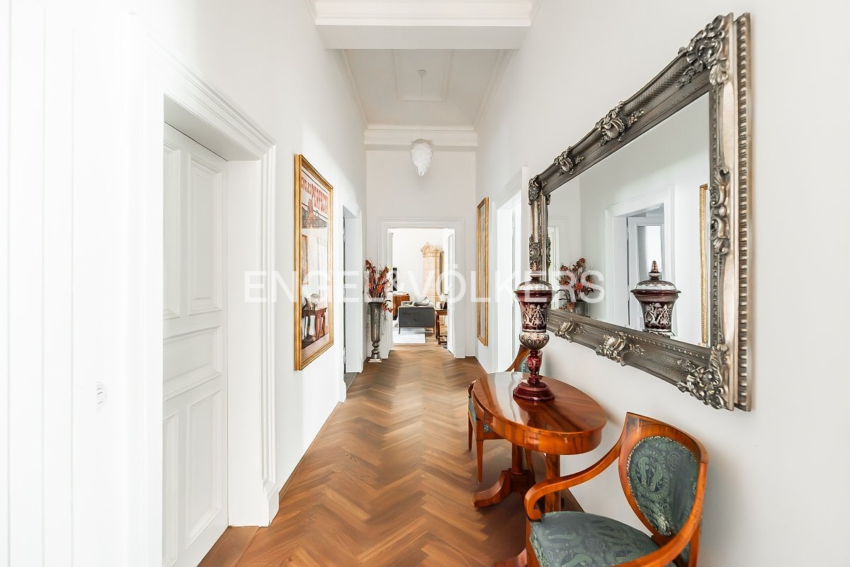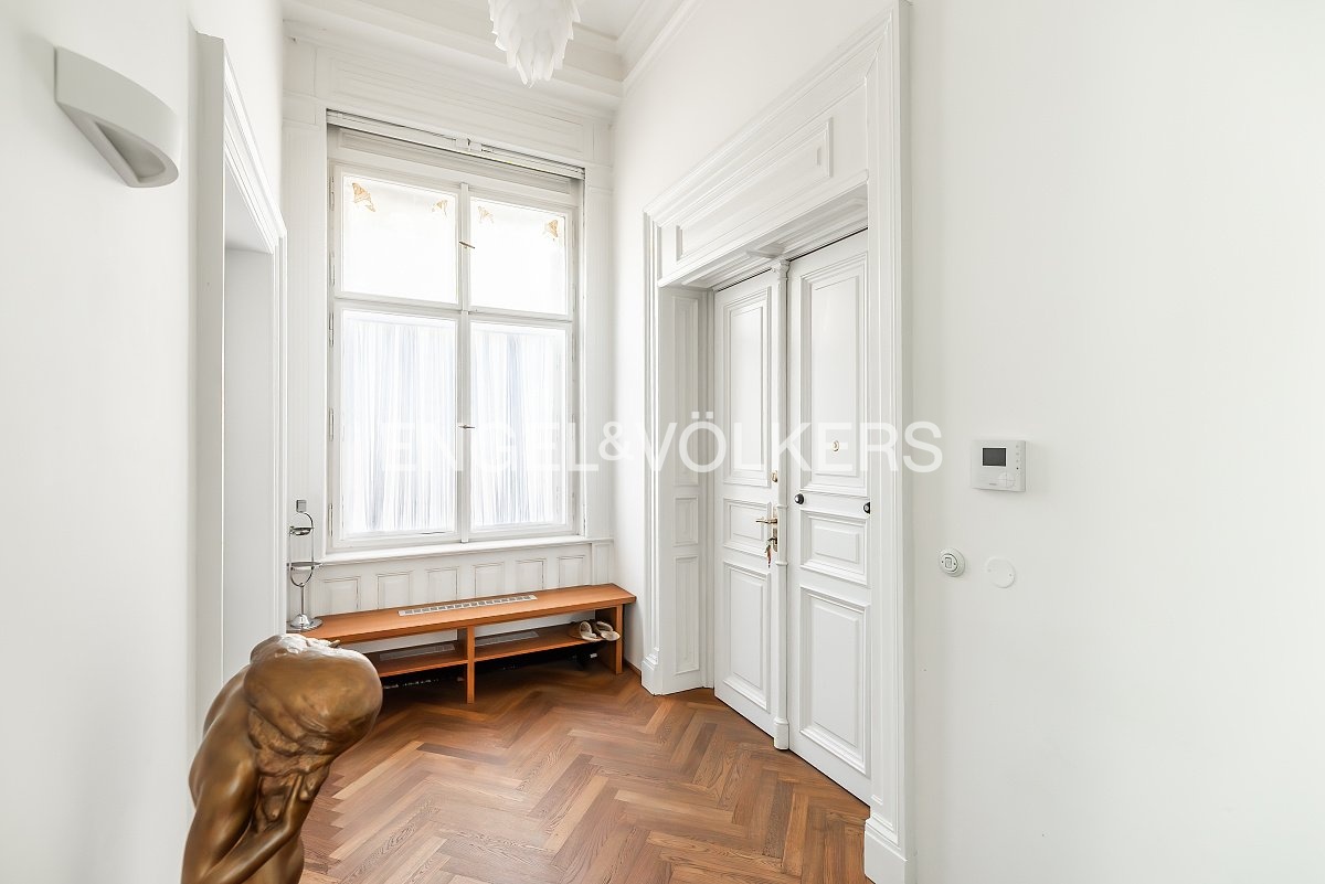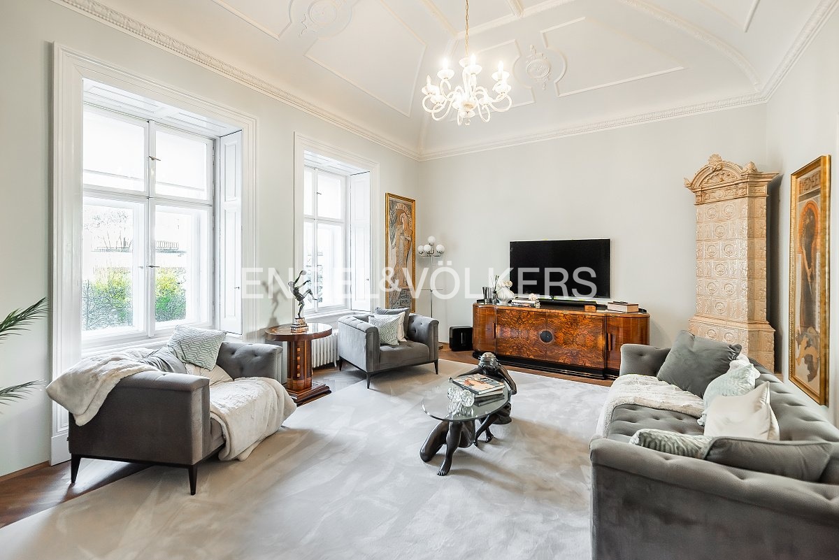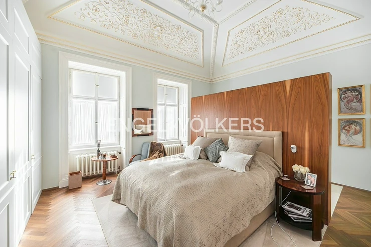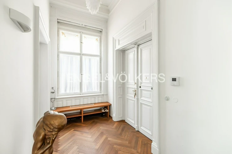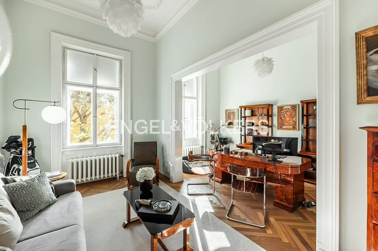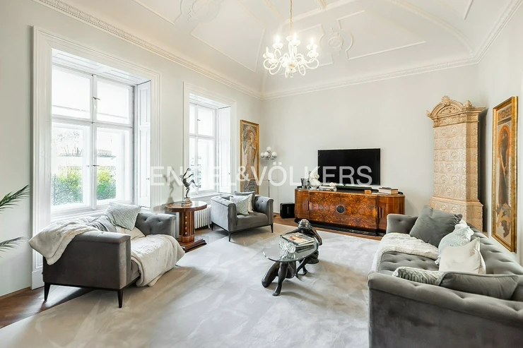 The interior has retained its original historical features – decorated and gilded ceilings, tiled stoves, and double doors. The apartment also offers parquet floors, stylish radiators and ceramic switches in a historical design, built-in wardrobes, refurbished windows, and interior shutters. Heating is provided by its own gas boiler.