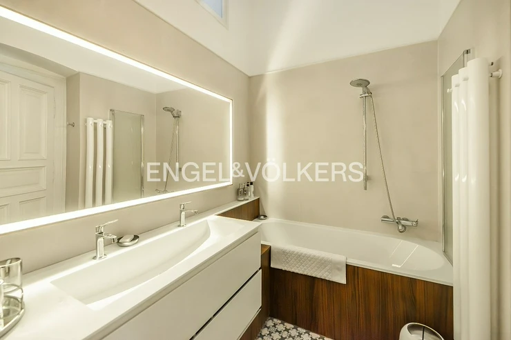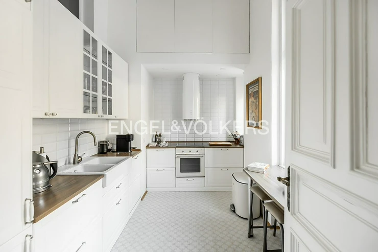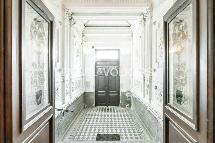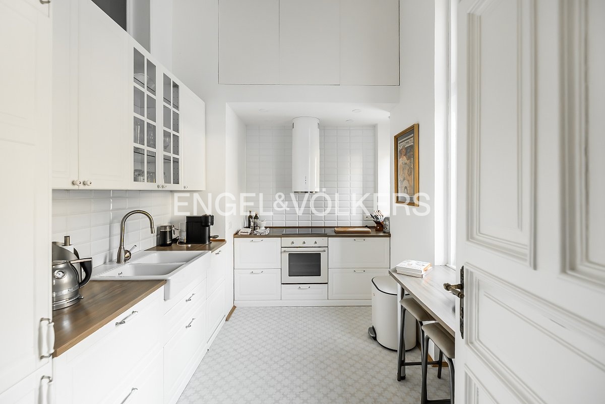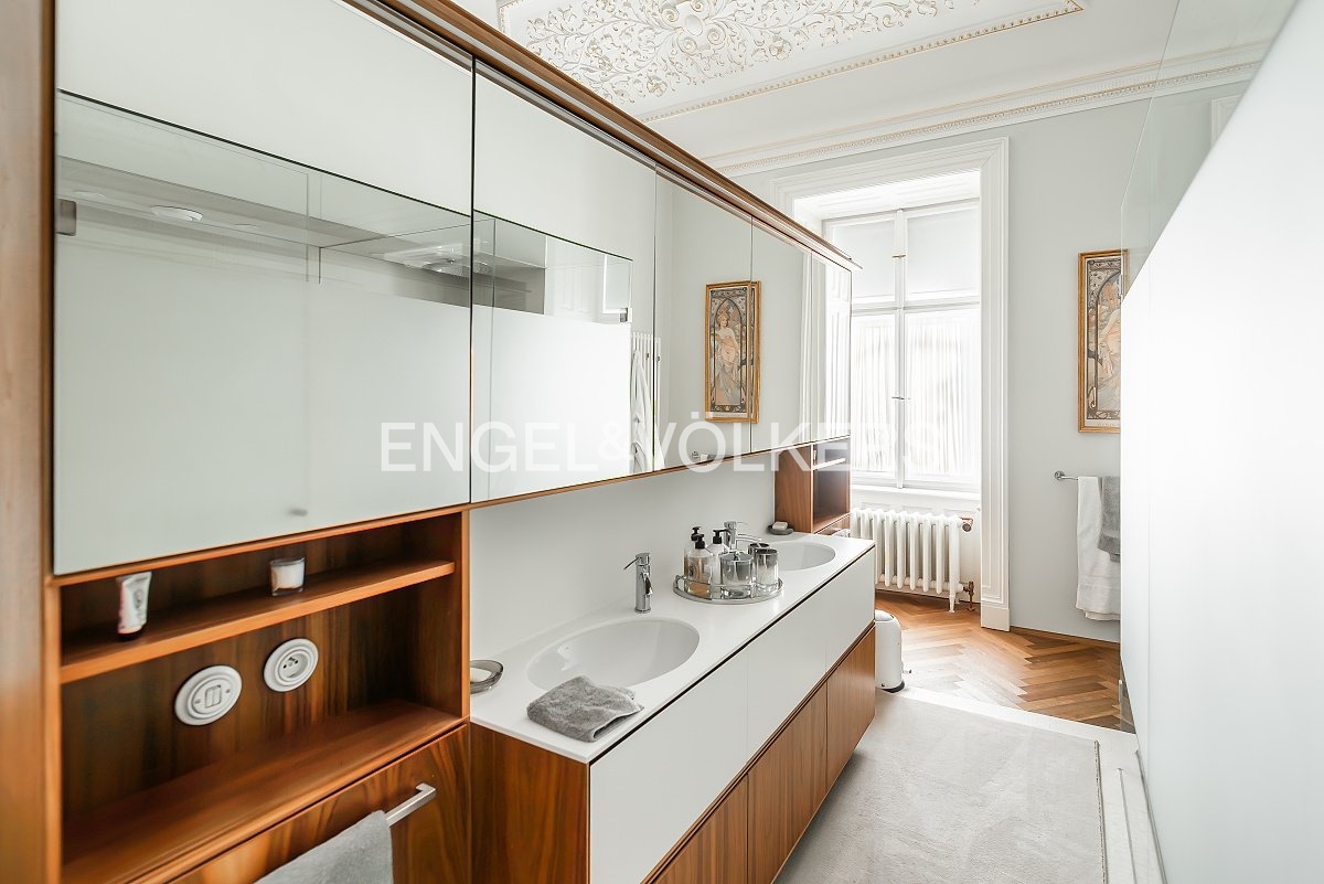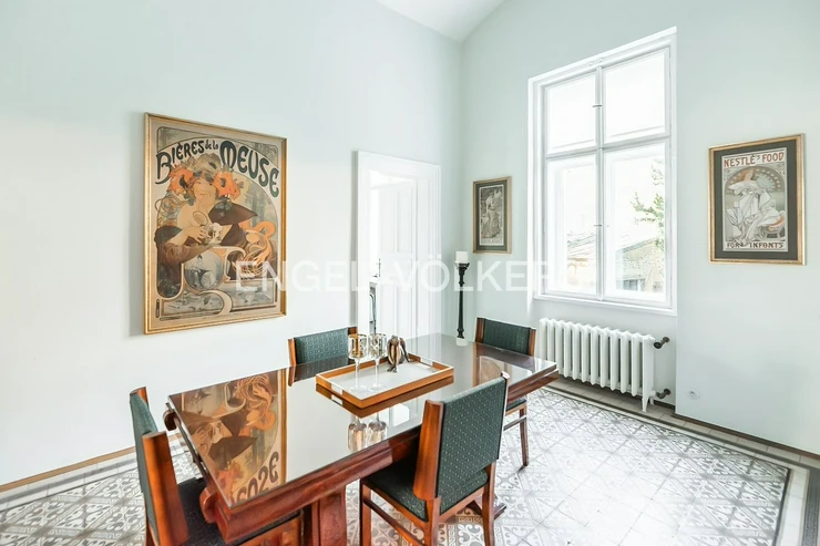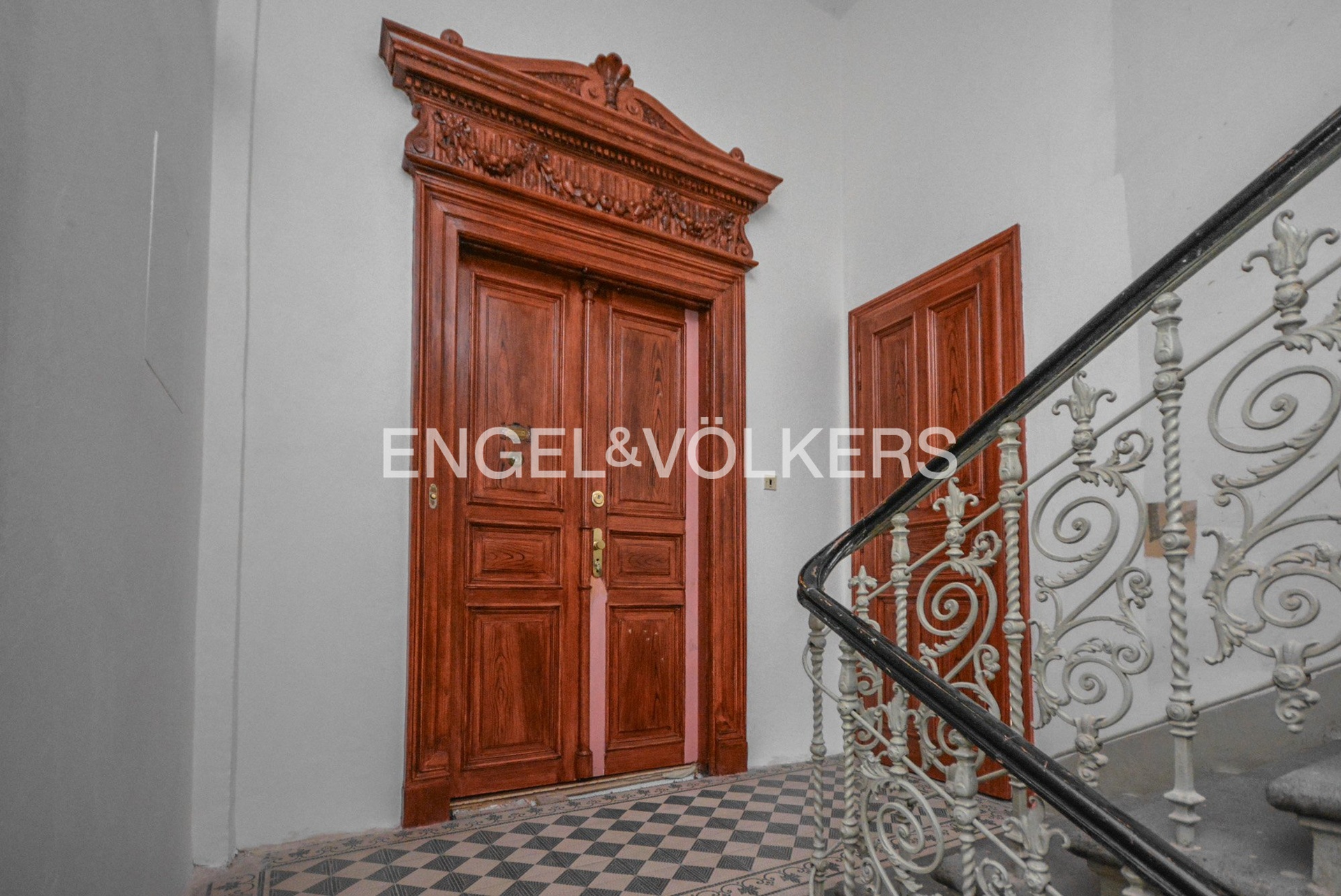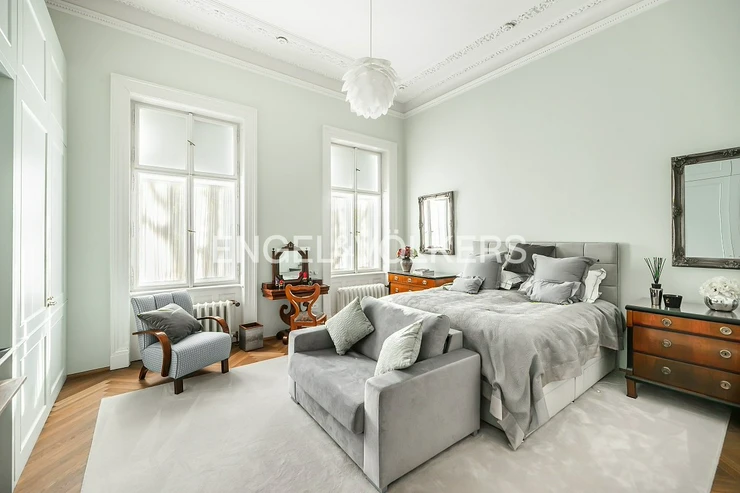 The interior has retained its original historical features – decorated and gilded ceilings, tiled stoves, and double doors. The apartment also offers parquet floors, stylish radiators and ceramic switches in a historical design, built-in wardrobes, refurbished windows, and interior shutters. Heating is provided by its own gas boiler.