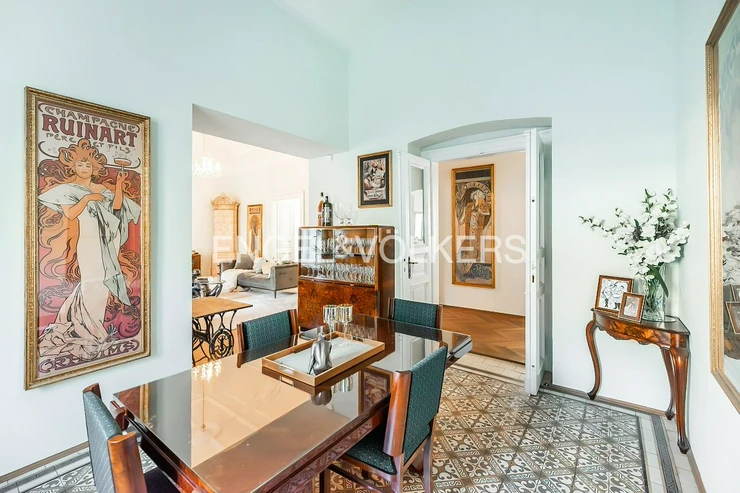 A unique 5+1 apartment with an area of 176 m² is available for long-term rent from 1. 5. 2026. It is located on the 1st floor of a small building in Malá Strana. The apartment consists of an entrance hall, a spacious living room, a separate dining room, a fully equipped kitchen, three bedrooms, two bathrooms, a separate toilet, a dressing room, and a pantry.