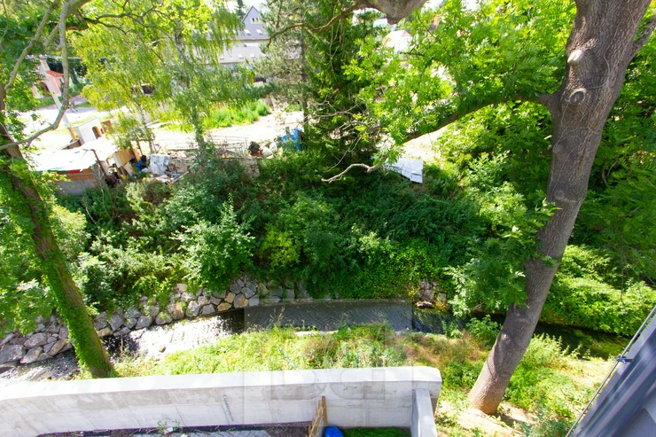 The building is located in a green area near the Únětický stream. A children’s playground is situated in front of the building, and nearby bus stops (U Dvora and Ke Kopanině) provide excellent connections to Prague (approx. 19 minutes to Metro Line A – Nádraží Veleslavín). The location is ideal especially for those working at the airport or seeking quiet living close to Prague.