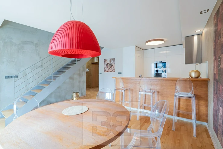 The main living area consists of a spacious kitchen with a dining area, which seamlessly connects to the living room, partially separated by a partition wall. This space provides access to two balconies. A staircase from the dining area leads directly to the rooftop terrace, adding a distinctive character to the property.