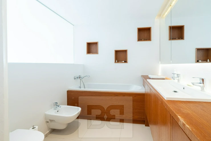 The apartment further offers two separate bedrooms, each with its own private balcony. There is a bathroom equipped with a bathtub, toilet, and bidet, as well as a separate toilet with a shower.