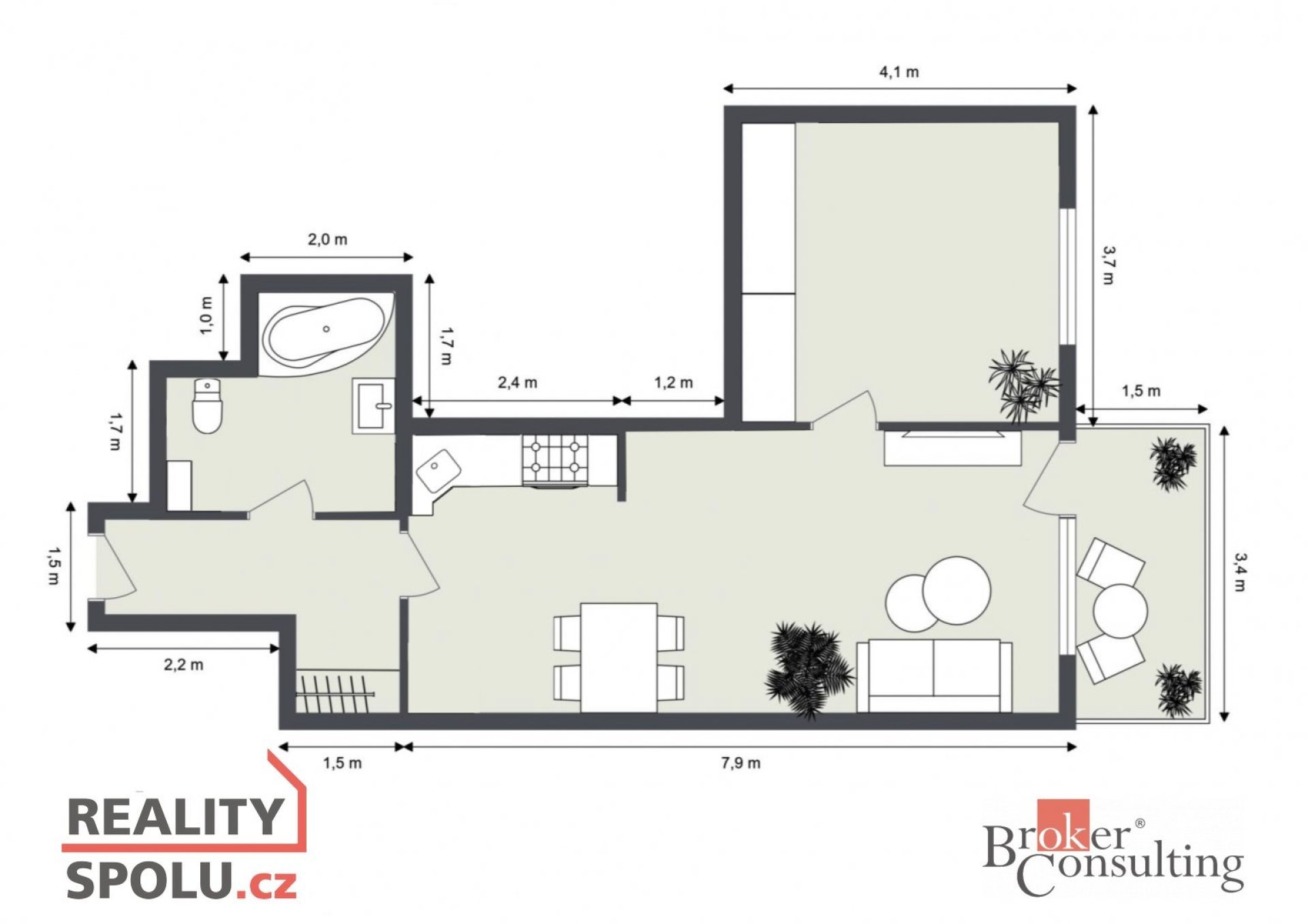 Dispozice: obývací pokoj s kuchyňským koutem, útulná ložnice, koupelna s WC a místem pro pračku, vstupní chodba. K bytu náleží sklepní kóje.